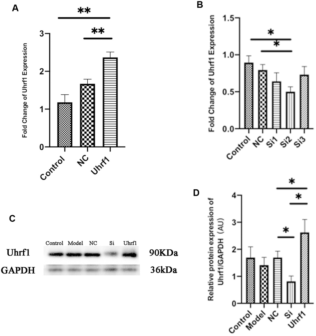 For amplification and extraction of Uhrf1 DNA plasmid pRP[Exp]-EGFP/Puro-CAG>mUhrf1 [NM_010931.3]* (Vector Builder), 2000 ng of the Uhrf1 plasmid was mixed with 15 μL of X-treme GENE siRNA Transfection Reagent (Roche, Basel, Switzerland) and dissolved in opti-MEM medium. The mixed liquid was added to the cardiomyocytes at 100 μL/mL culture solution. The siRNA sequence of Uhrf1 was labeled CCTTGCAGACCATTCTCAA, and 7 μL of this siRNA plasmid and blank NC plasmid (purchased from RIBBIO) were mixed with 10 μL of x-treme and dissolved in opti-MEM. The mixed liquid was added to the cardiomyocytes at 100 μL/mL culture solution. The cells were incubated for 24 hours.