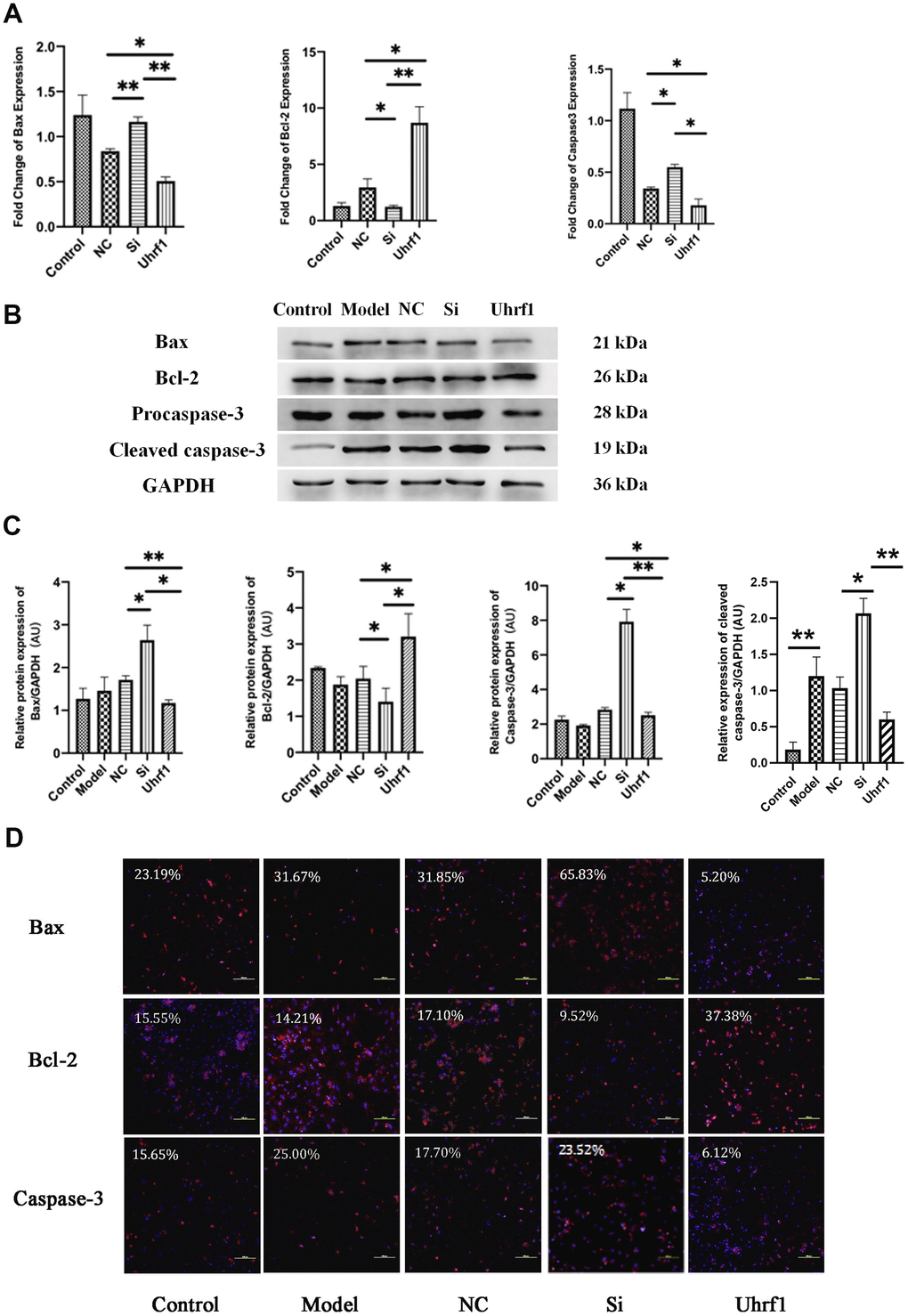 To confirm the effect of Uhrf1 in cardiomyocyte apoptosis, the mRNA and protein levels of Bcl-2, procaspase-3, cleaved caspase-3 and Bax (Figure 3A) were determined by qRT-PCR, western blot (Figure 3B, 3C) and immunocytochemistry analyses (Figure 3D). Our results show that overexpression of Uhrf1 reduces cardiomyocyte apoptosis after MIRI, decreases the expression of the apoptosis factors Bax, pro- and cleaved caspase-3 at both the mRNA and protein levels, and increases the expression of apoptosis inhibitory factor Bcl-2. Knockdown of Uhrf1in cardiomyocyte showed the opposite trend after MIRI.