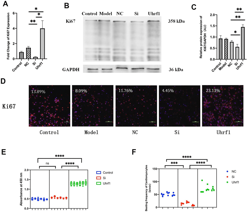 To explore the regulatory effect of Uhrf1 on the cell cycle and the activity of cardiomyocytes, we measured the expression of Ki67 (Figure 4A–4D), the activity of cardiomyocytes (Figure 4E), and the beating frequency of cardiomyocytes in each group (Figure 4F). Our results show that overexpression of Uhrf1 in MIRI increases Ki67 expression at both the mRNA and protein levels. Knockdown of Uhrf1 showed the opposite trend, suggesting that Uhrf1 can increase cardiomyocytes proliferation after MIRI. Using CCK8 to detect cell viability, we found that cardiomyocytes overexpression of Uhrf1 significantly increased the cell viability after MIRI, and there was no significant change in the viability of cardiomyocytes with Uhrf1 knockdown. Moreover, we observed that cardiomyocytes over-expressing Uhrf1 had higher beating frequency than the blank plasmid control after MIRI, while knockdown of Uhrf1 in cardiomyocytes resulted in lower beating frequency than the blank plasmid control.