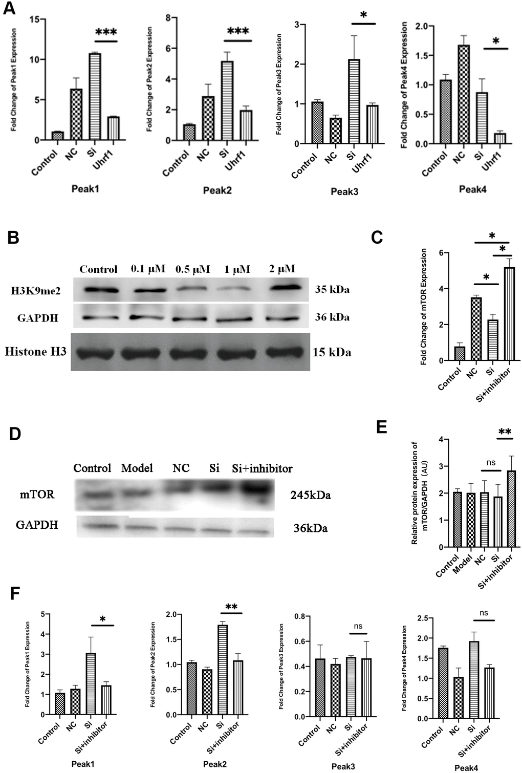 In the current study, the H3K9 dimethylation inhibitor BIX01294 was added to Uhrf1-knockdown cardiomyocytes damaged by MIRI to inhibit histone H3K9 dimethylation. H3K9me2 inhibition in cardiomyocytes was found to be most obvious at a concentration of 1.0 μM. Furthermore, a significant increase in mTOR expression was detected after adding 1.0 μM of G9a inhibitor to the Uhrf1-knockdown group. In addition, the expressions of peak 1 and peak 2 also decreased, and peak 3 and peak 4 did not change significantly. Thus, we confirmed that the regulatory mechanism of Uhrf1 on mTOR involves the regulation of H3K9me2 on the mTOR gene.