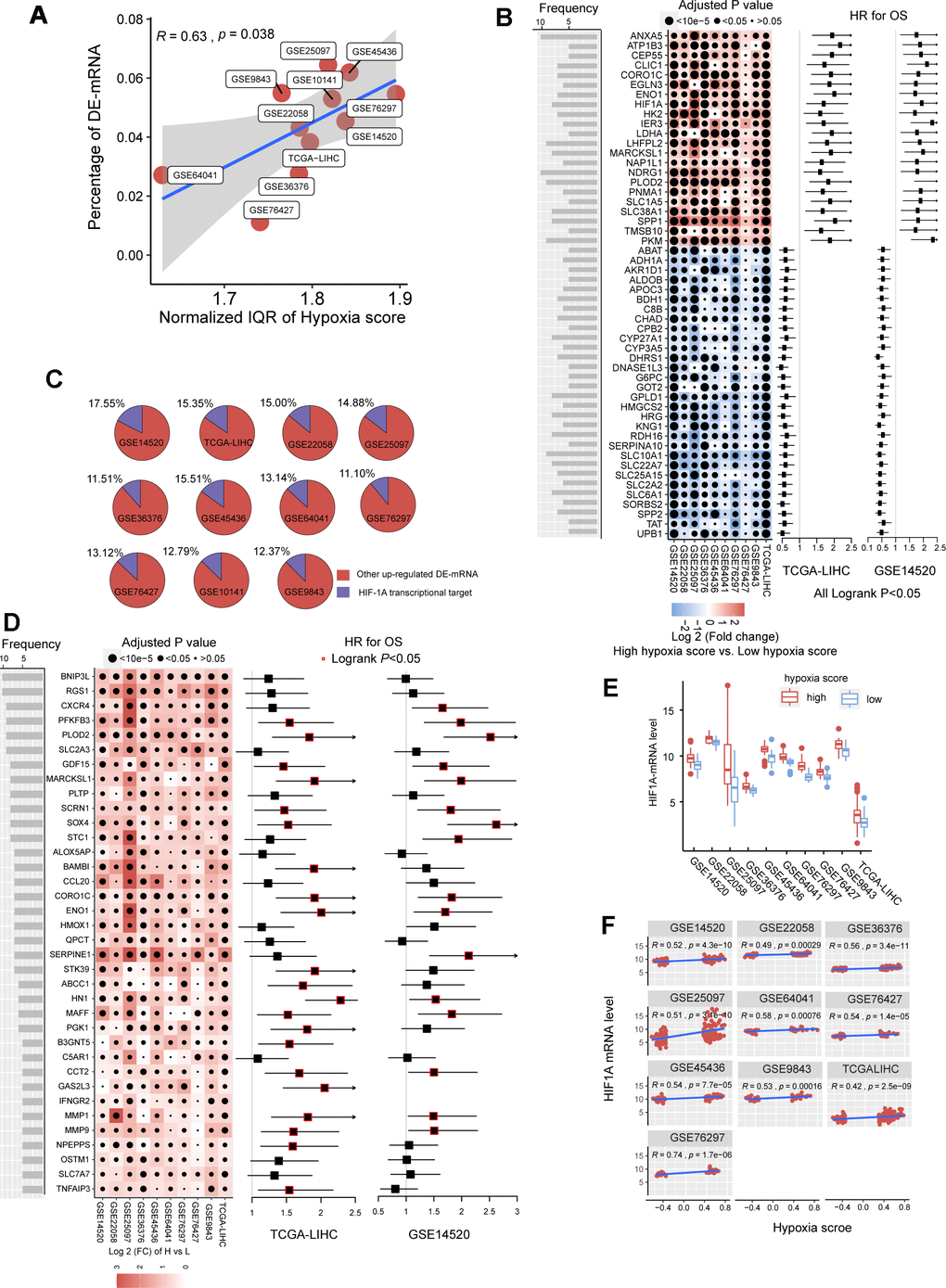 In the previous studies, we established a hypoxia score system based on a novel HCC-specific 21-gene hypoxia signature that could be used to effectively estimate the hypoxia exposure in HCC tissues. In the 10 GEO datasets and the TCGA dataset, hypoxia scores of each tumor tissue samples were calculated. Patients were significantly grouped as high hypoxia exposure group and low hypoxia exposure group according to the hypoxia score (Supplementary Figure 1). First, we analyzed the differences in mRNA expression between HCC patients with high hypoxia scores (greater than the upper quartile) and those with low hypoxia scores (less than the lower quartile) cross the 11 HCC datasets. Here, mRNA with log2FC > 0.58 or log2FC <-0.58 and adjusted P < 0.05 were defined as differentially expressed mRNA (DE-mRNA). In these cohorts, the proportion of DE-mRNA in the total mRNA measured was positively correlated with the interquartile range (IQR) of the liver cancer tissue hypoxia scores in this cohort (Figure 1A), suggesting that the difference in mRNAs was to some extent caused by the difference in hypoxia scores. We counted the frequency of each mRNA identified as a DE-mRNA in all cohorts and included DE-mRNAs with a frequency equal to or greater than 5 in the high frequency/DE-mRNA (HF/DE-mRNA) list. The mRNA changes in this list were relatively consistent among the 10 cohorts. A total of 371 mRNAs were selected, including 192 upregulated DE-mRNAs and 179 down-regulated DE-mRNAs. For a complete HF/DE-mRNA list, see Additional File 1: Supplementary Table 2. Based on the clinical data from the TCGA-LIHC and GSE14520 datasets, we performed survival analysis on 371 HF/DE-mRNAs (logrank test, cut-off = median expression level of candidate mRNA). Through Venny analysis, we integrated the survival data from the TCGA-LIHC and GSE14520 datasets and obtained 129 HF/DE-mRNAs related to HCC survival (logrank PTCGA-LIHC & logrank PGSE14520 < 0.05), which included 59 risk factors (HRTCGA-LIHC & HRGE14520 > 1) and 70 protective factors (HRTCGA-LIHC & HRGE14520 <1). There were 51 HF/DE-mRNAs that met the logrank P < 0.01 and HR < 0.7 or > 1.3 requirements in both of TCGA-LIHC and GSE14520 (Figure 1B). The results of the HF/DE-mRNA survival analysis (logrank test) are shown in Additional File 1: Supplementary Table 3.