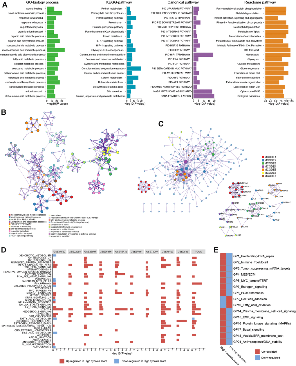 To further reveal the functions of HF/DE-mRNAs, the enrichments of biological processes and pathways involving HF/DE-mRNA were analyzed using data from different sources, such as Gene Ontology (GO) biological processes, Kyoto Encyclopedia of Genes and Genomes (KEGG) pathways, Reactome Gene Sets, and Canonical Pathways (Figure 2A). In addition to the response to hypoxia, HF/DE-mRNAs are mainly involved in biological processes related to metabolism, including glucose metabolism, lipid metabolism, and amino acid metabolism. As expected, pathway enrichment analysis results for data from multiple sources all showed significant enrichment of the HIF-1 pathway and glucose metabolism pathways; other enriched pathways were mainly related to various metabolic pathways. Besides, some classical tumor-related pathways, such as the PI3K-AKT signaling pathway and activated protein kinase (AMPK) signaling pathway, were also significantly enriched (Additional File 1: Supplementary Table 4). The pathways related to the regulation of the extracellular matrix were also associated with HF/DE-mRNAs. Therefore, we hypothesized that hypoxia exposure might affect the extracellular matrix, which determines tumor invasion and metastasis. To find the connection between terms in the enrichment analysis of biological processes and pathways, we clustered the terms and constructed a network (Figure 2B). The name of each cluster was the name of the most representative term, and the node size was the number of genes in the term. The names of all nodes can be found in Additional File 2. For the HF/DE-mRNA translation products, protein-protein interaction (PPI) enrichment analysis was carried out with the following databases: BioGrid6, InWeb_IM7, and OmniPath8. We constructed a PPI enrichment network of physical interactions using molecular complex detection (MCODE) (Figure 2C). The names of all nodes are listed in Additional File 3. The annotation of each MCODE is shown in Additional File 1: Supplementary Table 5. In addition to focusing on HF/DE-mRNAs, we used gene set enrichment analysis (GSEA) to reveal differences between hallmark gene sets between the high hypoxia score group and the low hypoxia score group based on all mRNA differences between the two groups (Figure 2D). The hypoxia gene set was upregulated in all cohorts with high hypoxia scores. The genes composing the glycolysis gene set was upregulated in the high hypoxia score groups of 9 cohorts. Other upregulated gene sets with high consistency in the 10 cohorts included the P53 pathway, PI3K/AKT/mammalian target of rapamycin (mTOR) signaling, TNFA signaling via NFKB, unfolded protein response, TGF-beta signaling, and MTORC1 signaling. Although the fatty acid metabolism pathway was downregulated in the high hypoxia score groups in the TCGA-LIHC and GSE14520 cohorts, downregulation was not consistent among the other pathways. After applying a bimodality filter and weighted gene correlation network-based clustering, Hoadley's team identified 22 nonredundant gene programs related to the biological behaviors of tumors [10]. We found 15 gene programs that were significantly different between the high hypoxia score group and the low hypoxia score group (Figure 2E), and the single-sample GSEA z-scores for some cancer-promoting gene programs increased in patients with high hypoxia scores.
