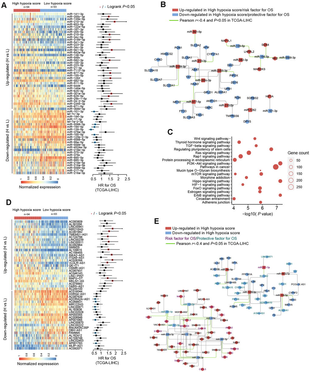 We used TCGA-LIHC data to analyze the differences in microRNAs (miRs) in HCC tissues with high hypoxia scores and low hypoxia scores. The miRs with log2FC > 0.58 or log2FC < -0.58 and adjusted P < 0.05 were defined as differentially expressed miRs (DE-miRs). We found a total of 63 DE-miRs, including 39 upregulated DE-miRs and 24 downregulated DE-miRs. Survival analysis showed that some DE-miRs were related to the OS rate (logrank test, cut-off = median expression level) of HCC patients (Figure 3A and Additional File 1: Supplementary Table 6). In our study, miR-210-3p had the smallest adjusted P value among the upregulated DE-miRs (log2FC = 2.41). Survival analysis using the median expression level as the cut-off showed that miR-210-3p had the largest HR (logrank P < 0.05) and that high miR-210-3p expression indicated a poor prognosis. Additionally, the passenger strand of miR-210 (miR-210-5p) was significantly upregulated in HCC tissues with high hypoxia scores, and high miR-210-5p expression also indicated a poor prognosis. Among the downregulated DE-miRs, miR-139-5p had the smallest adjusted P value (log2FC = -0.68). The response of miR-139-5p to hypoxia has not been reported. We found that low miR-139-5p expression indicates poor outcomes of HCC patients. Next, we predicted target mRNAs of DE-miRs. Combined with the HF/DE-mRNAs list, we obtained 2 independent DE-miRs-HF/DE-mRNAs networks, including upregulated DE-miRs/downregulated DE-mRNAs and downregulated DE-miRs/upregulated DE-mRNAs (Supplementary Figure 2). HIF-1A mRNA has a targeted relationship with some downregulated miRs, such as miR-101-3p and miR-194-3p. These miRs can explain the increase in HIF-1A mRNA expression in the high hypoxia score groups of the 10 cohorts. A survival-related refined network was obtained by combining the survival analysis results (Figure 3B). In this refined DE-miR/DE-mRNA network, all nodes were associated with the survival rate of HCC patients (logrank P < 0.05), and a negative correlation between nodes was indicated (r < -0.4 and P < 0.05). For example, miR-194-5p showed low expression in the high hypoxia score group, which was a protective factor for the survival rate. Its potential target genes, SOX4, HK2, MARCKS, and LHFPL2, showed high expression in the high hypoxia score group and were risk factors for the OS rate. The expression of miR-194-5p was significantly negatively correlated with the mRNA expression of SOX4, HK2, MARCKS, and LHFPL2. The elements in the refined DE-miR/DE-mRNA network should receive more attention. We performed KEGG pathway enrichment analysis on all target genes of DE-miRs. The enrichment results of the top 20 (according to the P-value) were shown in Figure 3C. Some important classical pathways related to tumor development, such as the Hippo pathway, TGF-beta pathway, Ras signaling pathway, mTOR pathway, PI3K-AKT pathway, Wnt pathway, and AMPK pathway, were involved. This result further suggests that these DE-miRs may have an unignorable role in HCC tissues with high hypoxia scores. Besides, more than 80% (54/63) of the DE-miRs had at least one target gene enriched in the HIF-1 signaling pathway. This confirms that DE-miRs identified by the 21-gene hypoxia signature is indeed hypoxic-related.