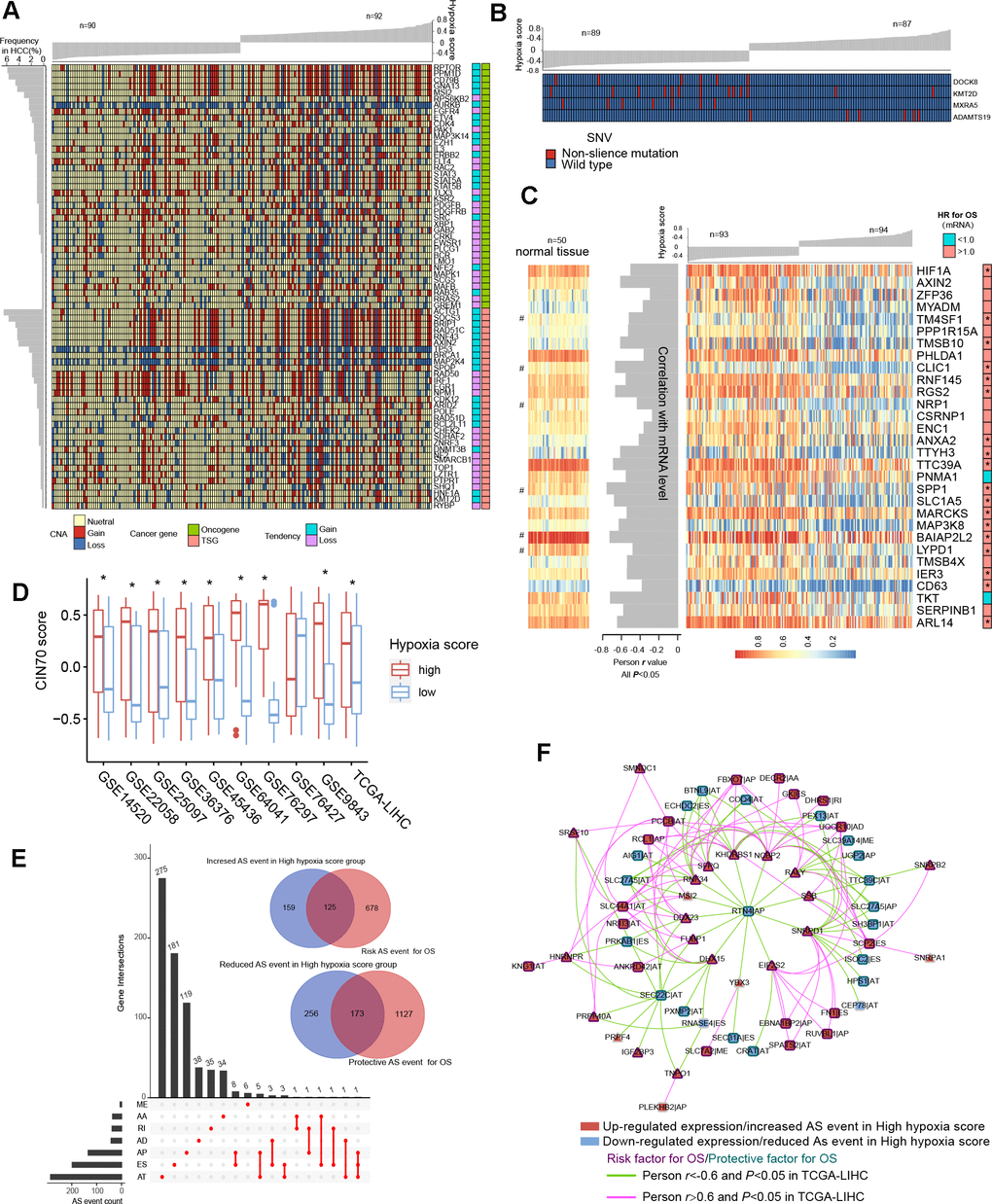 In genomic alterations analysis, CNAs changes suggested that the genomic instability of HCC patients may be related to hypoxia exposure. Few genes were significantly different in the incidence of SNVs between the high hypoxia and low hypoxia score groups. Hence, we believed that hypoxia has a limited ability to induce SNVs, and important SNVs likely occur before the onset of hypoxia. Epigenetic alterations suggested that hypoxia exposure may promote the hypomethylation of some genes related to the onset and progression of HCC and that the hypomethylation of some other genes may be a characteristic feature of hypoxia exposure. Moreover, RNA alternative splicing and m6A modification were another important epigenetic feature under hypoxia which expanded our understanding of the role of hypoxia in HCC.