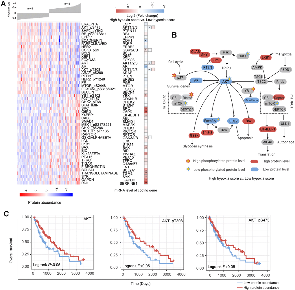 Based on the reverse phase protein array (RPPA) data of the TCGA-LIHC cohort, we analyzed the differences in the abundance of 218 proteins between the high hypoxia score group and the low hypoxia score group. A total of 50 proteins exhibited differences in abundance between the two groups (Figure 5A). Increases in LKB1 and mTOR activity inhibition are hallmark events of hypoxia exposure, which once again confirmed the efficacy of our 21-gene signature in indicating hypoxia exposure. Approximately half of the protein changes were inconsistent with the changes in their mRNA levels, suggesting that the regulation of posttranslational levels by hypoxia cannot be ignored. The differentially expressed proteins were mainly concentrated in AKT/mTOR and its related pathways. The reduction in the AKT level and its phosphorylation level seems to be a core event. The change trends for some proteins were opposite to those reported by the relevant literature on AKT (Figure 5B), which suggests that in addition to the regulation of AKT, there may be a complex regulatory network that has not been discovered. Survival analysis (cut-off = median value, Figure 5C) showed that a low abundance of AKT, AKT-pT308 and AKT_pS473 indicated worse OS (except for AKT_pS473, logrank P < 0.05). Hypoxia may induce some functions by inhibiting AKT in HCC. Overall, the changes in the proteins between the two groups reflected the dynamic balance of autophagy/apoptosis and the response to hypoxic stress to some extent. These proteins may affect the viability of the cells under hypoxia and their tolerance to hypoxia. Moreover, the altered protein abundance between the two groups may be related to the different drug sensitivities of HCC patients in the two groups. The correlation between some proteins differentially expressed in the two groups and drug sensitivity is shown in Supplementary Figure 8 (based on data from the MD Anderson Cell Lines Project and the Genomics of Drug Sensitivity in Cancer database). For example, the reduction in AKT_pS473 may cause the sensitivity of cells to sorafenib to decrease. Therefore, when formulating a treatment plan, it may be necessary to evaluate the hypoxic condition of the lesions.