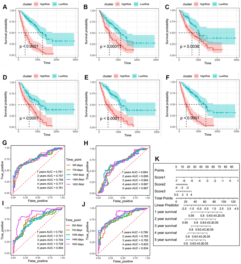 Finally, we performed a prognostic validation using three independent models and a combined model. The results demonstrated that the group survival verifications of the three independent models and the combined model were significant (Figure 3A–3F). The receiver operating characteristic (ROC) curve showed that the area under the curve (AUC) values of the combined model within 1–5 years were all greater than 0.75 in the discovery cohort, which were also greater than the AUC of the independent models (Figure 3G–3J). This suggests that the combined model has a better predictive value for the prognosis of the IPF patients. We further developed a nomogram for 1–5 years of overall survival prediction based on the combined Cox model (Figure 3K).