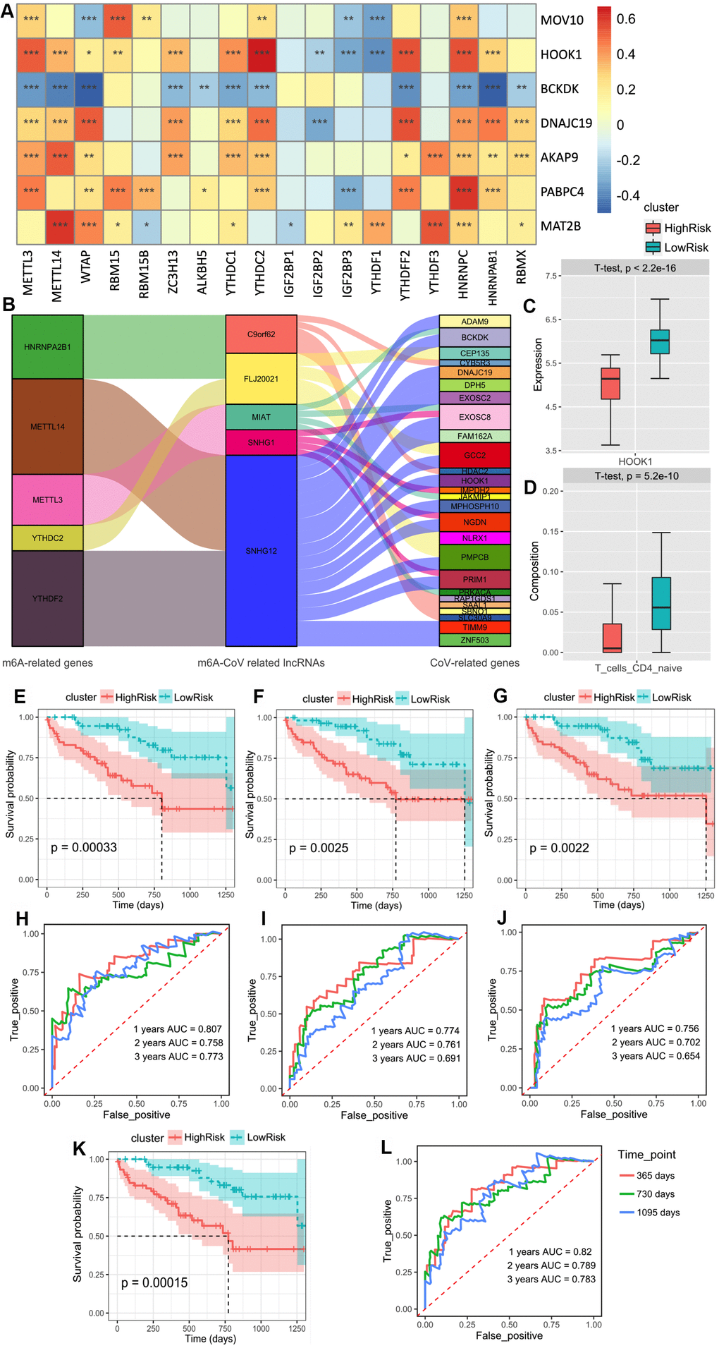 Based on the risk models of m6A-related-CoV genes (Score 1), m6A-CoV related lncRNAs (Score 2), and SARS-CoV-2 related immune infiltration patterns (Score 3), multivariate Cox regression was used to establish the combined model: Score-combined = 0.7902 × Score 1 + 0.576 × Score 2 + 0.4434 × Score 3.