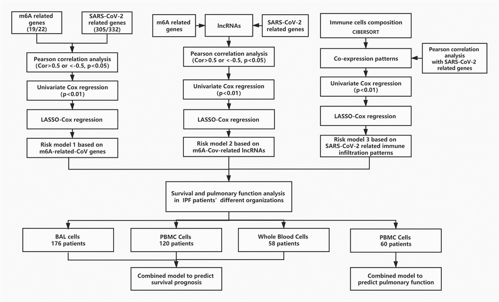 In conclusion, we identified SARS-CoV-2 related genes associated with IPF prognosis and lung function and demonstrated that their expression was widely regulated by m6A regulators. In addition, we found some characteristic co-expression networks of immune cells and SARS-CoV-2 related genes that were thought to mediate special immune response patterns in IPF. Our research is important for further understanding the genetic and cellular links between IPF and SARS-CoV-2 infection in the context of the COVID-19 pandemic. These associations could also be beneficial for the management of IPF and COVID-19.