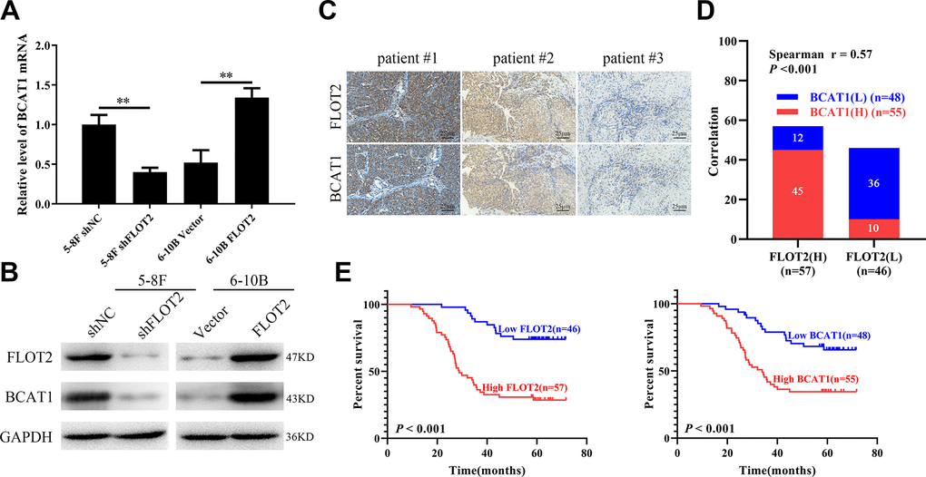 Previously, we used cDNA microarray (GSE67456) to explore the effects of FLOT2 knockdown on the transcription profile in NPC cells [13]. The results showed that BCAT1 was downregulated in 5-8F-shFLOT2 cells. Thus, the expression of BCAT1 was further validated in NPC cells by altering the expression of FLOT2. qPCR and western blot analysis (Figure 1A, 1B) revealed that FLOT2 knockdown significantly decreased BCAT1 expression, while FLOT2 overexpression remarkably increased BCAT1 expression in 5-8F and 6-10B cells, respectively. FLOT2 expression levels in NPC cells were also determined by altering the expression of BCAT1 alteration. The results showed that both BCAT1 knockdown and overexpression had no effects on FLOT2 expression (Supplementary Figure 1).