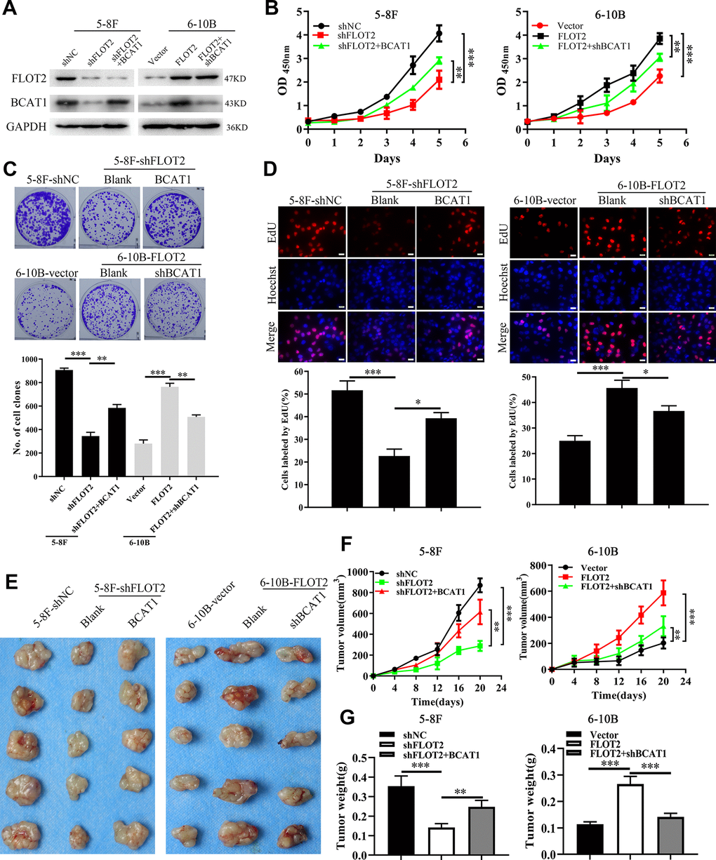 Next, we explored whether BCAT1 mediated FLOT2 function in NPC. Firstly, western blot analysis successfully demonstrated ectopic expression of BCAT1 in 5-8F-shFLOT2 cells and BCAT1 depletion in 6-10B-FLOT2 cells (Figure 2A). In vitro and in vivo experiments determined the effects of BCAT1 alterations on cell proliferation. CCK-8, plate clone formation, and EdU incorporation assays revealed that BCAT1 restoration significantly rescued the inhibitory effects of FLOT2 knockdown on 5-8F cell proliferation (Figure 2B, left arm; 2C upper arm; 2D left arm). Depletion of BCAT1, antagonized the pro-proliferation effects of FLOT2 overexpression on 6-10B cells (Figure 2B, right arm; 2C low arm; 2D right arm). Consequently, ectopic expression of BCAT1 remarkably removed the inhibition of FLOT2 silencing on subcutaneous growth of 5-8F cells (Figure 2E–2G, left arm); while BCAT1 knockdown significantly counteracted the activation of FLOT2 overexpression on subcutaneous growth of 6-10B cells (Figure 2E–2G, right arm). Therefore, these results indicated that FLOT2 promoted the proliferation of NPC cells via positive regulation of BCAT1 both in vitro and in vivo.