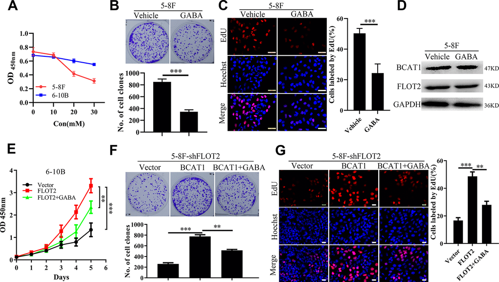 BCAT1 function depends on its enzymatic activity [17]. Therefore, BCAT1 activity was inhibited with gabapentin (GABA), a γ-aminobutyric acid analogue and a competitive inhibitor of BCAT1, to determine its effects on NPC cell proliferation. Firstly, NPC cell viability was measured using CCK-8 assay, at different gabapentin concentrations. As shown in Figure 3A, GABA inhibited the growth of 5-8F cells expressing high levels of BCAT1, in a dose-dependent manner, but exerted little influence on the growth of 6-10B cells expressing low levels of BCAT1. We further explored the inhibitory effects of GABA on NPC cell proliferation. Consistently, the inhibitory effects of GABA on NPC cell proliferation were further supported by results of the plate clone formation (Figure 3B) and EdU incorporation assays (Figure 3C). Besides, GABA did not influence the protein expression level of BACT1 and FLOT2 (Figure 3D). However, CCK-8 (Figure 3E), plate clone formation (Figure 3F), and EdU incorporation assays (Figure 3G) showed that GABA treatment significantly antagonized the rescue effects of BCAT1 on 5-8F-shFLOT2 cell proliferation. Taken together, these results suggested that the pro-proliferation role of BCAT1 highly depends on its enzymatic activity in NPC.