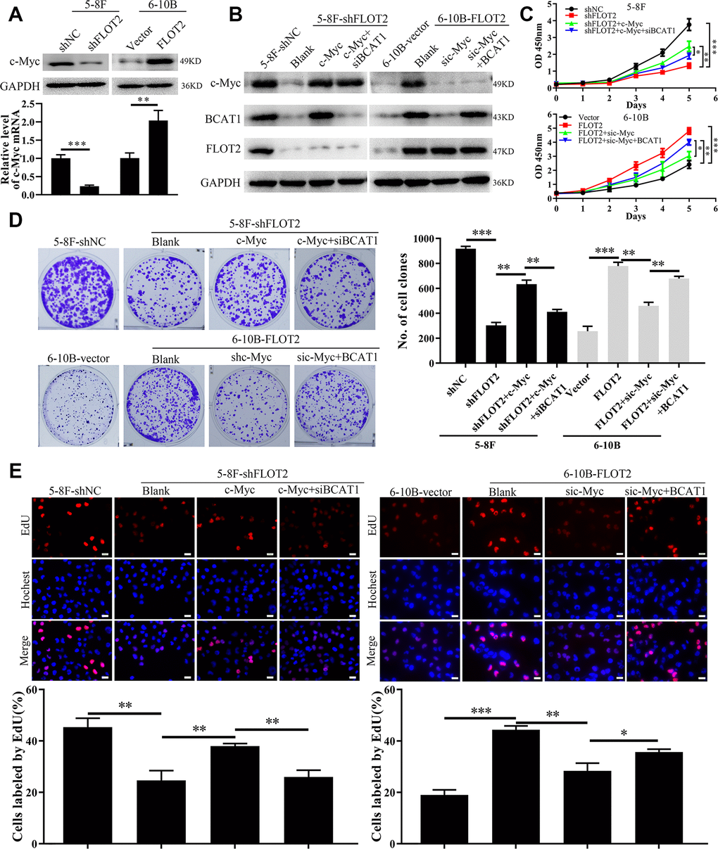 Our previous study confirmed that c-Myc promoted BCAT1 transcription in NPC cells [25]. Therefore, in the current study, we explored whether FLOT2 increased BCAT1 expression via c-Myc. Indeed, both mRNA and protein expression levels of c-Myc were downregulated in 5-8F-shFLOT2 cells and upregulated in 6-10B-FLOT2 cells (Figure 4A), respectively. Moreover, ectopic expression of c-Myc restored BCAT1 expression which was decreased by siBCAT1 in 5-8F-shFLOT2 cells (Figure 4B, left arm). c-Myc knockdown in 6-10B-FLOT2 downregulated BCAT1 expression levels, which was restored by ectopic expression of BCAT1 (Figure 4B, right arm). Similarly, functional experimental results revealed that the proliferative capacity of 5-8F-shFLOT2 cells was restored by ectopic expression of c-Myc (Figure 4C, upper arm; 4D, 4E, left arm), which was suppressed by BCAT1 knockdown. c-Myc knockdown inhibited 6-10B-FLOT2 cell proliferation, which was restored after ectopic expression of BCAT1 (Figure 4C, low arm, 4D, 4E, right arm). Furthermore, in our previous study, we investigated the effects of BCAT1 and c-Myc depletion on AKT and NF-κB activity, which mediates FLOT2 oncogenic role in NPC [13]. Both BCAT1 and c-Myc knockdown significantly inhibited AKT and NF-κB activity, which was confirmed by a decreased in p-AKT and p-p65 expression (Supplementary Figure 2A) in NPC cells. Considering that inhibition of AKT and NF-κB activity by MK2206 and BAY 11–7082, respectively, exert no notable effects on the expression levels of BCAT1 and c-Myc (Supplementary Figure 2B), suggests that AKT and NF-κB could serve as the downstream signaling of c-Myc/BCAT1 in mediating the functions of FLOT2 in NPC. Therefore, these results demonstrated that FLOT2 upregulated BCAT1 and promoted NPC cell proliferation via positive regulation of c-Myc.