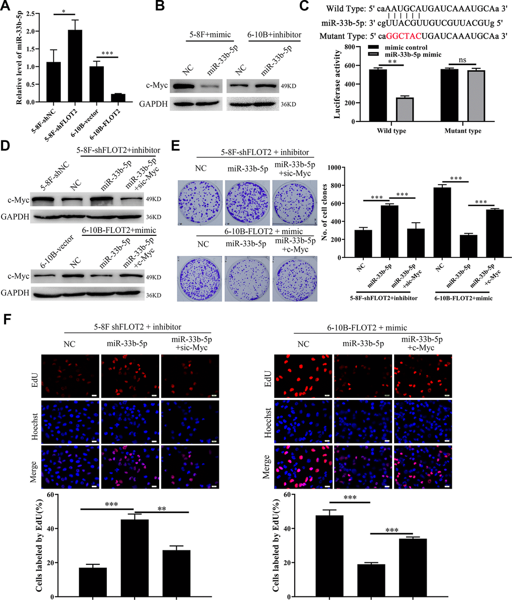 We explored the molecular mechanism of FLOT2 regulation of c-Myc in NPC cells. Generally, both transcriptional and post-transcriptional mechanisms can lead to fluctuation of mRNA levels [26]. Therefore, qPCR was used to detect the expression of c-Myc hnRNA in FLOT2 knockdown NPC cells using two sets of specific primers amplifying intron-1 and -2, respectively. We found that the knockdown of FLOT2 had no significant effect on the expression of c-Myc hnRNA in NPC cells (Supplementary Figure 3A), suggesting that FLOT2 mediates the post-transcriptional mechanism of c-Myc regulation in NPC cells. Moreover, MG132, a proteasome inhibitor, could not rescue the down-regulation of c-Myc (Supplementary Figure 3B), indicating that FLOT2 does not affect c-Myc stability. Therefore, we further investigated whether miRNAs, the most common post-transcriptional regulators, mediated the regulation of c-Myc in NPC cells through FLOT2. We predicted the candidate miRNAs targeting c-Myc via ENCORI (The Encyclopedia of RNA Interactomes) database. miR-33b-5p, a tumor suppressor gene, which directly inhibits c-Myc in several cancers, was selected for validation [27–30]. Indeed, silenced FLOT2 upregulated the miR-33b-5p level in 5-8F cells, while FLOT2 overexpression downregulated miR-33b-5p expression in 6-10B cells (Figure 5A). Besides, miR-33b-5p mimic significantly downregulated c-Myc in 5-8F cells, while miR-33b-5p inhibitor upregulated c-Myc in 6-10B cells (Figure 5B). Moreover, miR-33b-5p significantly inhibited luciferase activity of 5-8F cells transfected with wild-type c-Myc plasmids (Figure 5C), confirming that miR-33b-5p directly targeted c-Myc in NPC cells. Consequently, miR-33b-5p inhibitors restored c-Myc levels in 5-8F-shFLOT2 cells (Figure 5D, upper arm), and miR-33b-5p mimics reduced the level of c-Myc in 6-10B-FLOT2 cells (Figure 5D, low arm). miR-33b-5p inhibitors restored 5-8F-shFLOT2 cell proliferation, which was suppressed by c-Myc knockdown (Figure 5E, upper arm, Figure 5F, left arm). miR-33b-5p mimics, on the other hand, inhibited 6-10B-FLOT2 cell proliferation, which was rescued by ectopic expression of c-Myc (Figure 5E, low arm, Figure 5F, right arm). Our results indicated that FLOT2 activates c-Myc/BCAT1 and promotes NPC cell proliferation through suppressing miR-33b-5p.