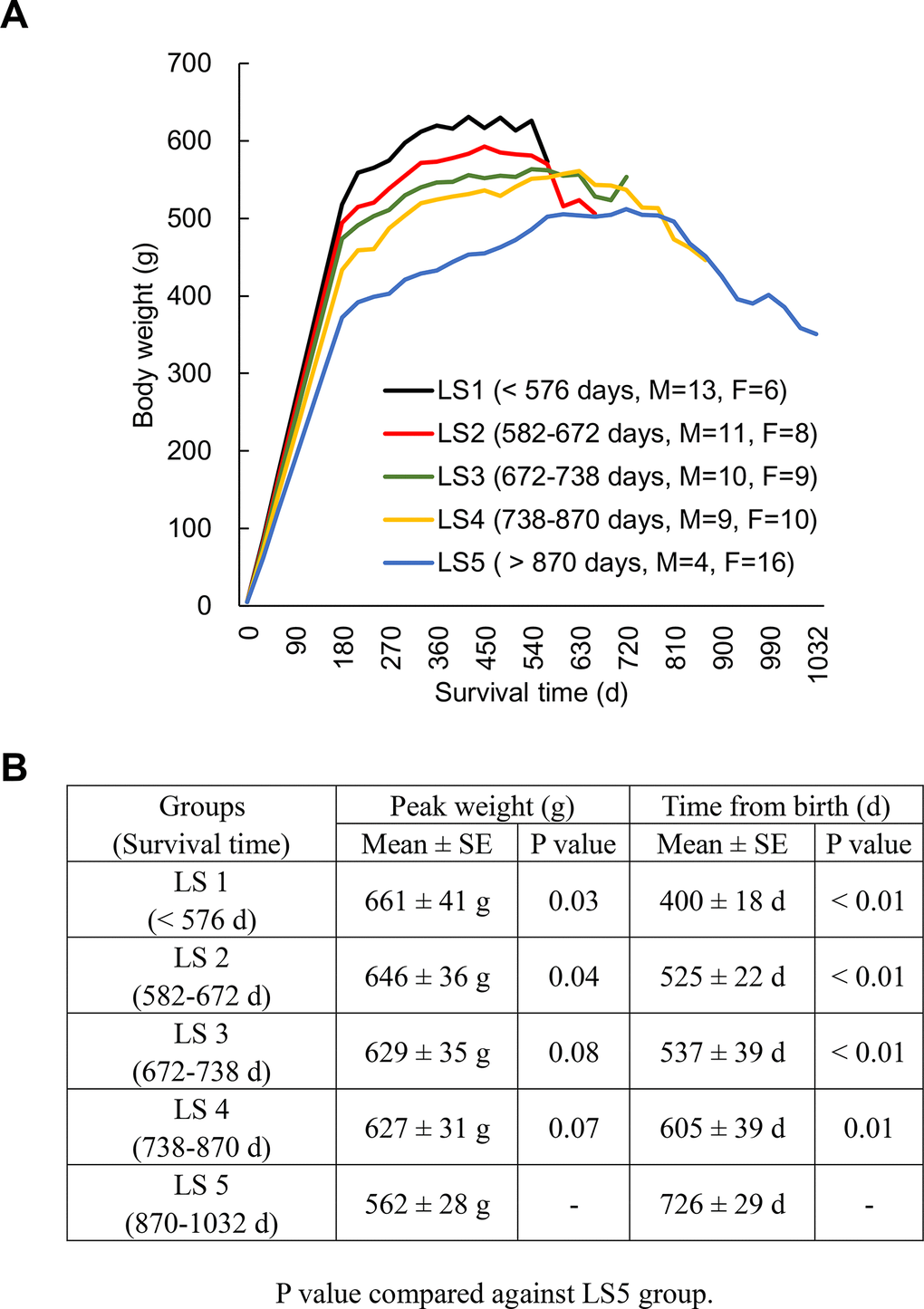 Figure 1A shows the weight trajectory pattern of 96 rats ranked into 5 groups according to lifespan (LS), assigned after natural death of all animals. All groups of rats show a common trajectory pattern of two discrete life phases: weight gain (long) and weight loss (short) periods. A linear (inverse) relationship between average survival time and peak weight of the groups ranked from the shortest (LS1) to the longest (LS5) lived groups was observed (Figure 1B). Long-lived rats are characterized by the modest weight gain for the first three quarters of life followed by delayed weight loss until the end of life compared to the rest groups. Female-to-male ratio of each group increases as lifespan increases. Therefore, both male and female rats were further dichotomized into fast growth group and slow growth group. Growth rates (1st year) for males are 2.13 g/d (fast growth halves) and 1.83 g/d (slow growth halves) and for females are 1.12 g/d (fast growth halves) and 0.92 g/d (slow growth halves). Median lifespans and for males are 654 d (fast growth halves) and 714 d (slow growth halves) and for females are 762 d (fast growth halves) and 780 d (slow growth halves).