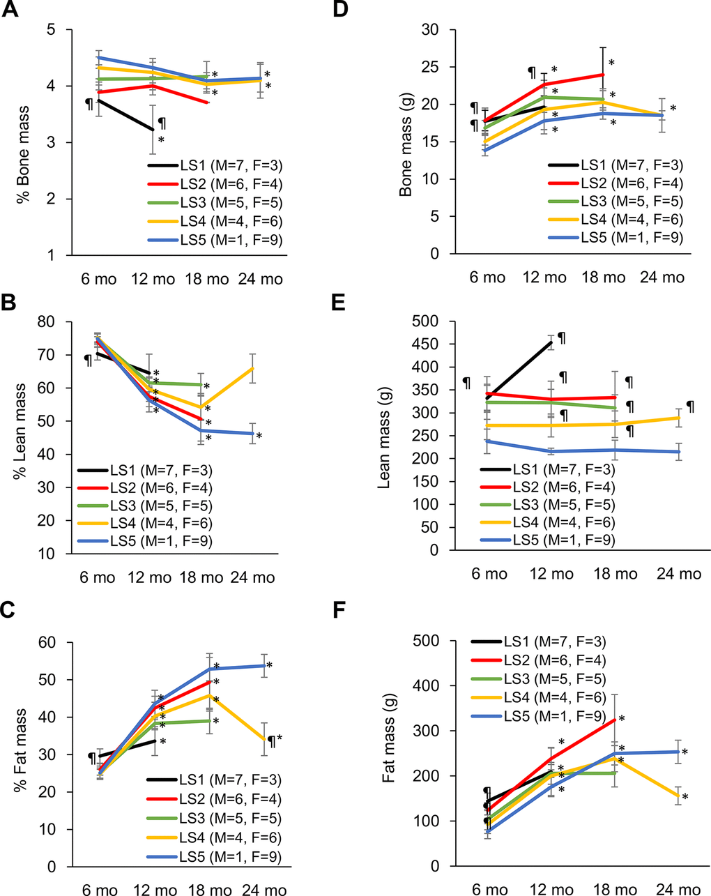 Evolutions of bone mass percentage, lean mass percentage, and fat mass percentage for the 5 groups ranked by lifespan are shown in Figure 2. At 6 months of age, the long-lived group is characterized by higher bone mass percentage (Figure 2A), higher lean mass percentage (Figure 2B), and lower fat mass percentage (Figure 2C) relative to their short-lived counterparts. However, survivors after 12 months of age show progressive decreases in lean mass percentage and bone mass percentage concurrent with increase in fat mass percentage. The most striking feature for the long-lived rats is the persistently highest bone mass percentage across the entire observation period with modest decline during end-of-life (Figure 2A). Increased lean mass percentage in the LS2 group is associated with faster fat mass loss. The absolute bone mass in the short-lived groups was relatively greater than those in the long-lived groups (Figure 2D). The lower bone mass percentage in the short-lived groups was associated with relatively greater absolute lean mass (Figure 2E) and fat mass (Figure 2F).