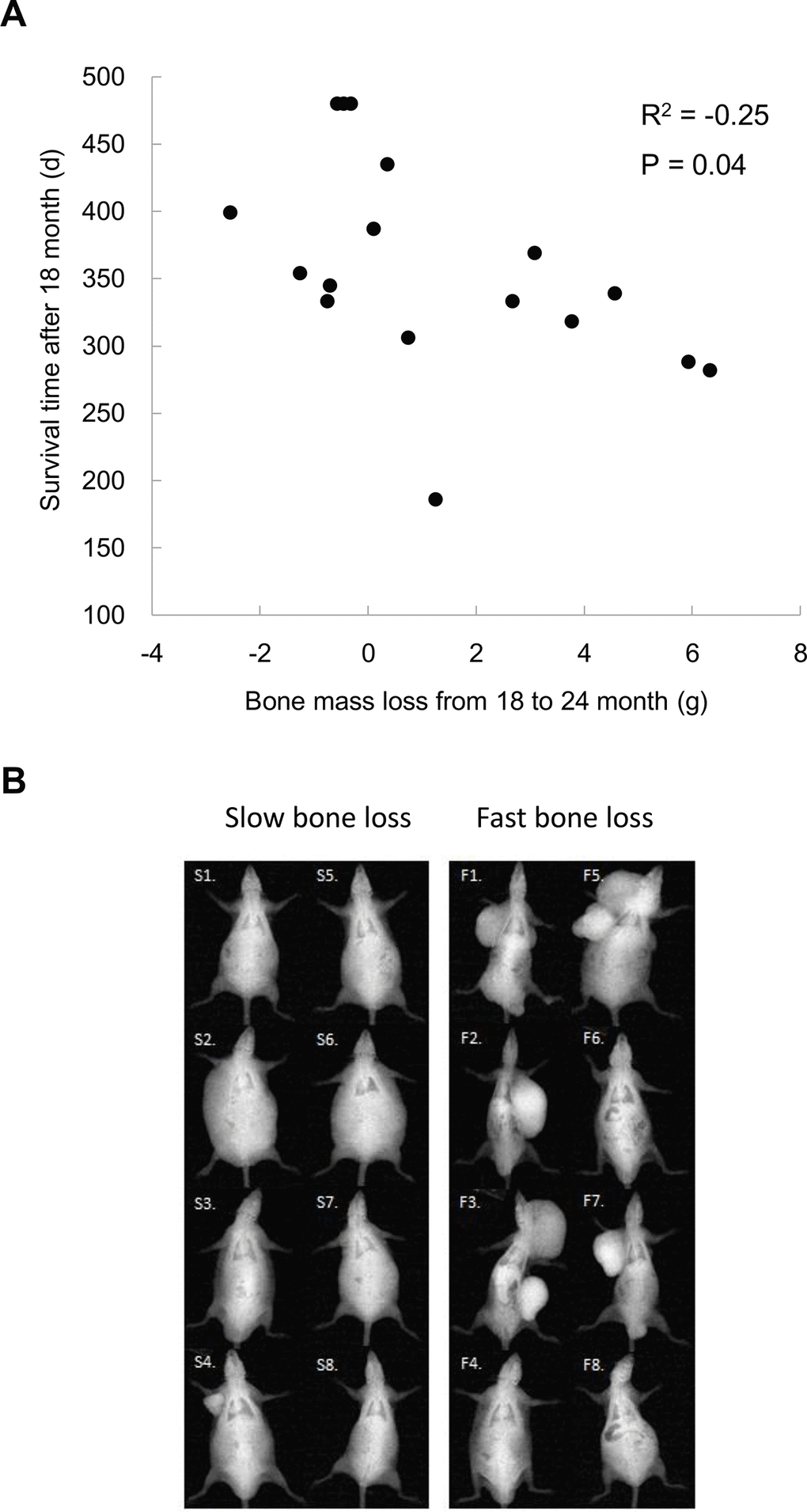For those long-lived survivors (LS4 and LS5 groups), bone mass loss occurred after 18 months of age. The residual survival time after 18 months of age significantly correlated with bone mass loss including one outlier (Figure 3A). Based on X-ray image, the topmost 8 rats with the fastest bone mass loss exhibit apparently greater incidence of tumorigenesis and cachexia compared with bottommost 8 counterparts showing the slower bone mass loss during the same observation period (Figure 3B).