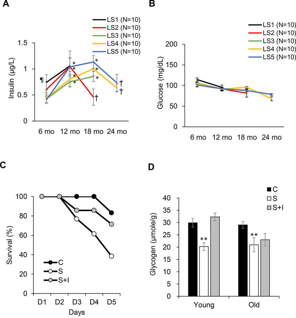 Fasting insulin levels from 6 to 24 months of age are shown in Figure 4. Short-lived rats (LS1) exhibit greatest hyperinsulinemia at 6 months of age compared with the rest groups (Figure 4A). The long-lived rats (LS4 and LS5) show delayed hyperinsulinemia and reached to similar insulin levels as the short-lived rats (LS 1 and LS2) at 18 months of age, followed by ~35% decline of insulin at 24 months of age. Glucose was not significantly different among the 5 groups and was not much changed during the 24-month period (Figure 4B). To determine the role of late-life insulin decline in lean mass loss (sarcopenia and osteopenia), STZ was injected to both young (aged 4 months) and old (aged 20 months) rats, with or without insulin co-injection. The survival rates in 5 days were 100%, 35%, and 71% for the control, STZ, and STZ + Insulin groups, respectively (Figure 4C). Survival rate of young rats (4 months of age) was not affected by STZ injection (100% survival rate). STZ eliminated plasma insulin level to an undetectable level and decreased glycogen concentration of soleus muscle by ~30%. Insulin injection to STZ-treated rats replenished muscle glycogen in young rats but had minimal effect in old rats (Figure 4D).