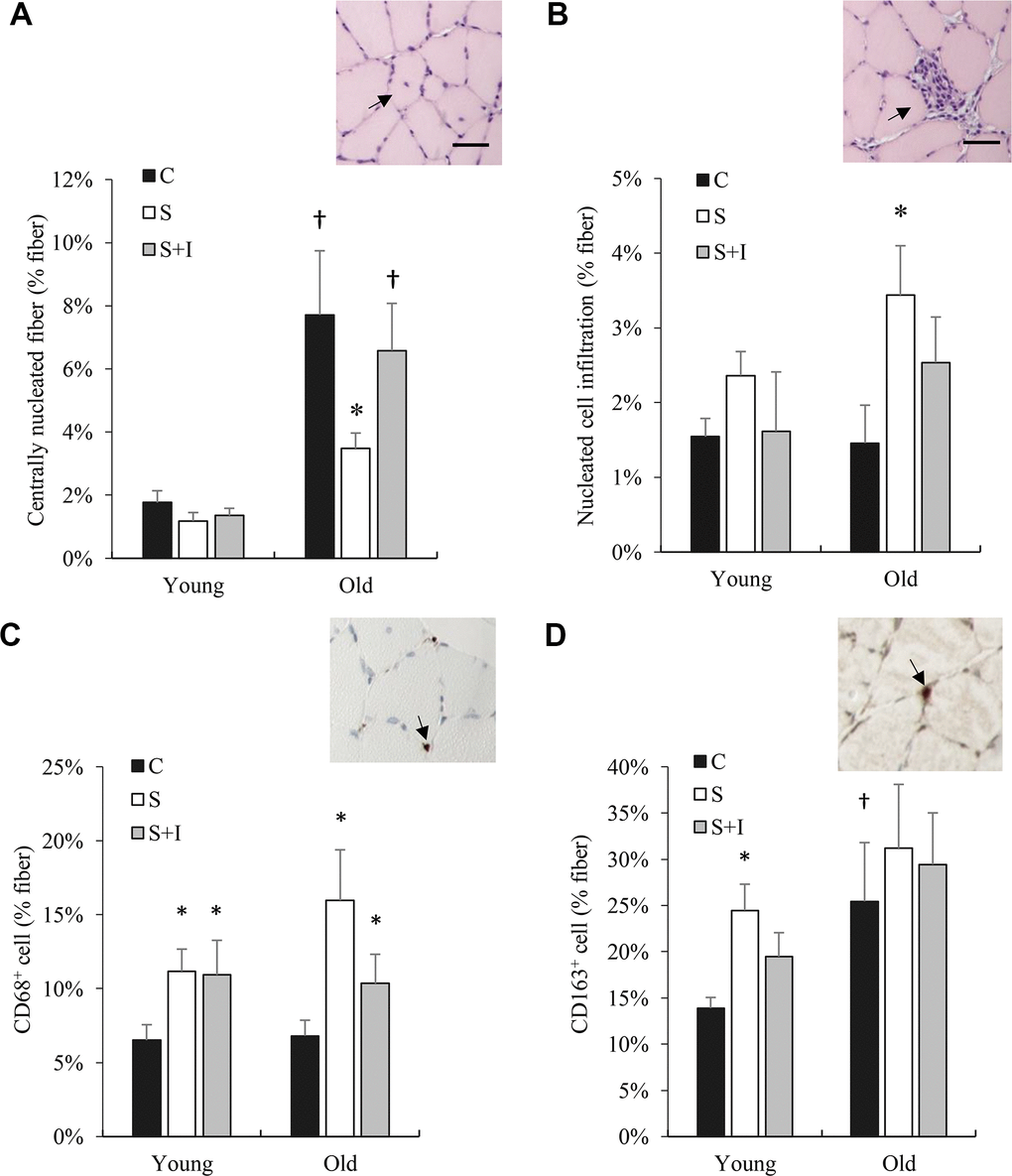 In normal untreated rats, myofiber regeneration (centronucleation) of the 20-month rats was approximately 8-fold (Figure 5A) greater than that of the 4-month rats. Insulin depletion significantly lowered myofiber regeneration concurrent with ~50% greater cell infiltration for both young and old rats (main effect, P < 0.01) (Figure 5B). Insulin injection partially reversed these changes. Phagocytic M1 macrophage (CD68+ positive cells) in soleus muscle of both young and old rats was significantly increased in the STZ injected group above their control groups (P < 0.05) (Figure 5C). Regenerative M2 macrophage (CD163+ positive cells) in soleus muscle of old rats was substantially greater than those of young rats (Figure 5D). Insulin injection showed a small effect in reversing this change.