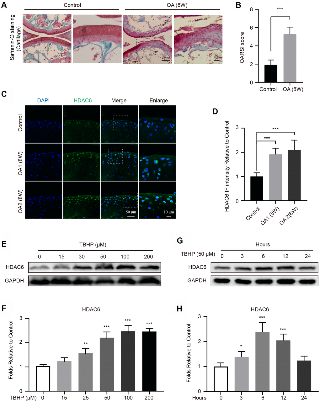 To establish an OA model, mice were performed by surgical destabilization of the medial meniscus (DMM). After 8 weeks, the cartilages were stained with Safranin O, and the results showed that DMM group exhibits the devastative superficial articular cartilage (Figure 1A, 1B). Subsequently, the expression of HDAC6 in cartilages were evaluated in the Control and OA groups, the results of immunofluorescence (IF) staining revealed that the intensity of HDAC6 was significantly increased in 8 weeks after the mouse OA modelling was performed (Figure 1C, 1D). In addition, to further evaluate the change of HDAC6 in cells, we separately cultured primary chondrocytes and found that the level of HDAC6 is gradually upregulated under tert-butyl hydroperoxide (TBHP) stimulation in a dose-dependent manner (Figure 1E, 1F). Meanwhile, HDAC6 was also increased when chondrocytes were subjected to TBHP treatment in a time-dependent manner and reached the peak at 6 hours after TBHP treatment (Figure 1G, 1H). Therefore, these data indicated that HDAC6 is increased in chondrocytes and may be involved in the progression of OA.