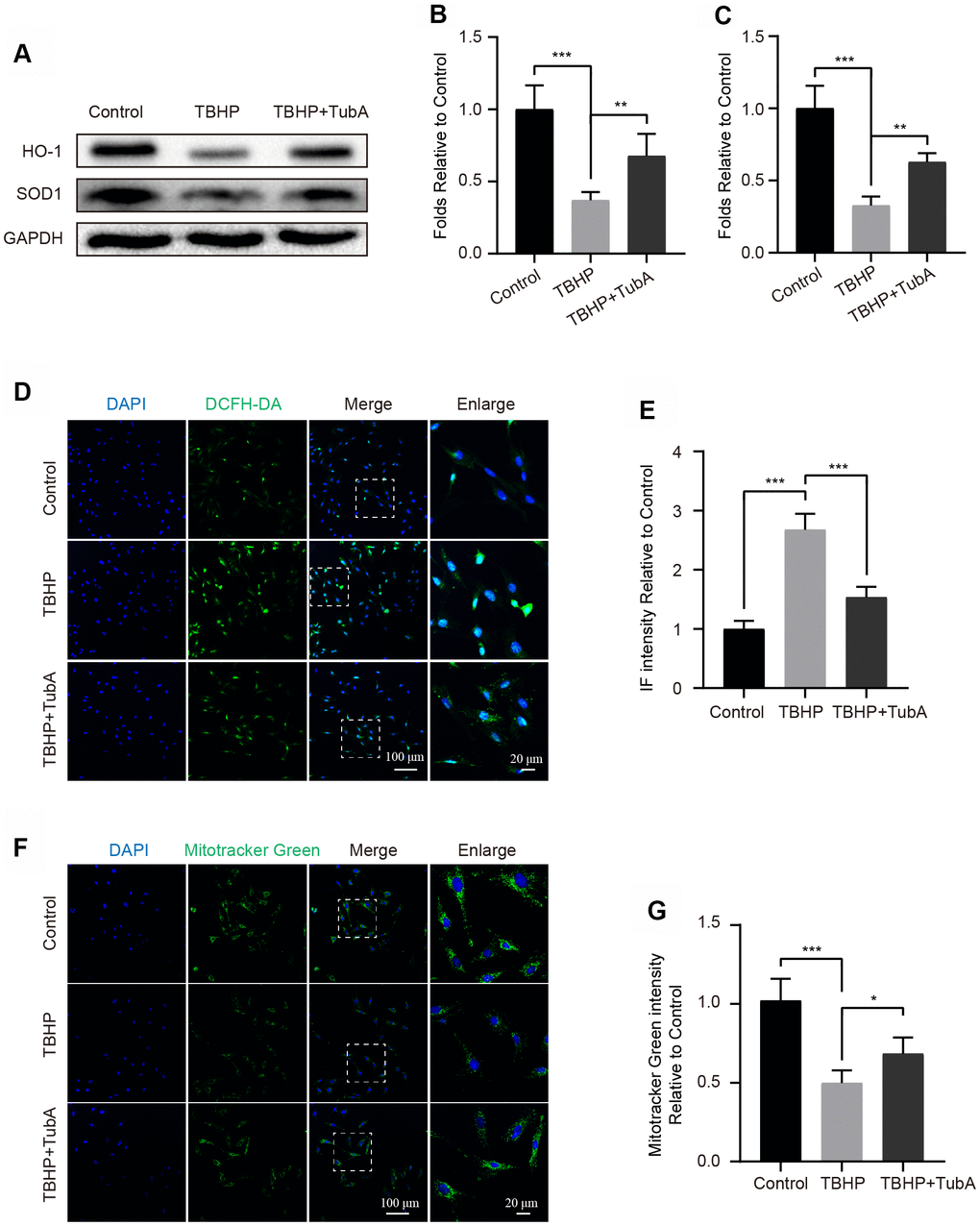 The oxidative stress is one of the critical factors in the development of OA [29]. Here, we evaluated whether TubA is sufficient to attenuate cellular oxidative stress after TBHP stimulation. The Western blotting analysis indicated that TubA treatment effectually upregulated the level of SOD1 and HO-1. Both of them are important enzymes related to counteraction of oxidative stress (Figure 3A–3C). Consistence with Western blotting, the results of the ROS Assay Kit further confirmed that TubA remarkably decreased the intensity of DCFH-DA (Figure 3D, 3E). In addition, TubA treatment also enhanced the fluorescence intensity of Mitotracker Green in TBHP-treated chondrocytes (Figure 3F, 3G). Collectively, these data indicate that TubA is beneficial for reducing oxidative stress in chondrocytes.