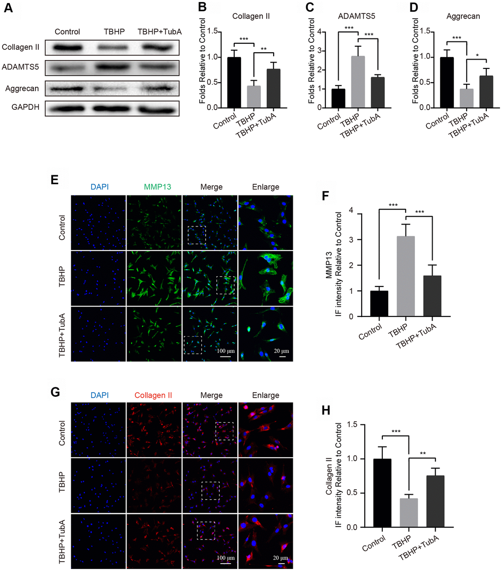 To determine whether HDAC6 inhibition by TubA is a contribution to the ECM synthesis, we detected the levels of several markers of ECM by Western blotting and IF. The results from Western blotting indicated that administration of TBHP significantly reduced the level of Collagen II and Aggrecan but increased the expression of ADAMTS5. In contrast, TubA reversed the above undesirable effects resulting from TBHP (Figure 4A–4D). Likewise, results from IF. Respectively, stained with Collagen II (Figure 4E, 4F) and MMP13 (Figure 4G, 4H) are in accordance with the Western blot analysis. Overall, these results demonstrated that TubA acts in a beneficial role in regulating ECM synthesis and metabolism.