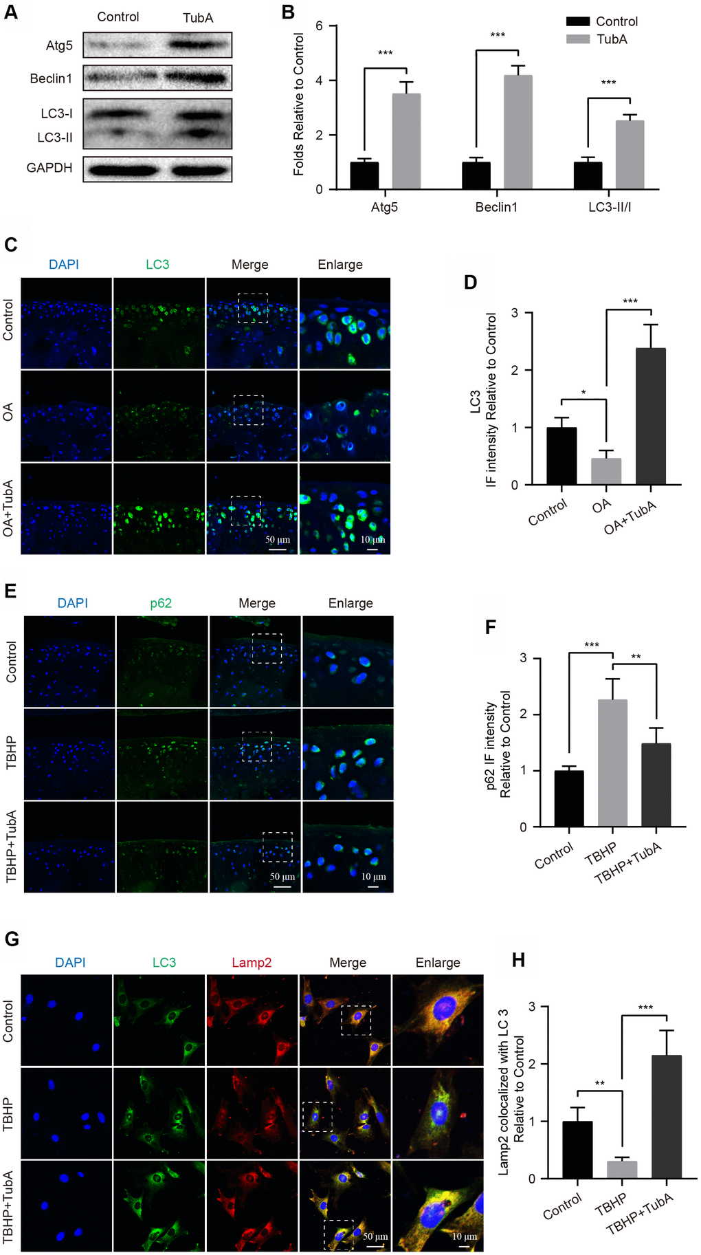 Autophagy is a routine process for the removal of excess or damaged molecules in the development of ageing [19]. Regarding the beneficial effects of TubA on chondrocytes, we speculated that the underlying factor may be partly related to the modulation of autophagy. To evaluate the effect of TubA on chondrocyte autophagy, the level of autophagy relevant markers was measured by Western blotting. Like the results presented in Figure 5A, 5B, TubA treatment significantly increased the expression of Atg5, Beclin1 and LC3 II/I when compared with the control group. Furthermore, the increased LC3 (Figure 5C, 5D) and decreased p62 (Figure 5E, 5F) intensity were also observed in TubA-treated OA mice through staining with LC3 and p62, respectively. Considering that the fusion of autophagosome and lysosome is a critical process for the clearance of adverse molecules after the activation of autophagy, we analysed the colocalization of LC3 and Lamp2 in chondrocytes. The results from IF indicated that TBHP intervention causes a lower fusion dot of LC3 and Lamp2, whereas it is enhanced by TubA treatment (Figure 5G, 5H). Therefore, these results indicated that TubA activates the chondrocyte autophagy and may be involved in the beneficial effects.