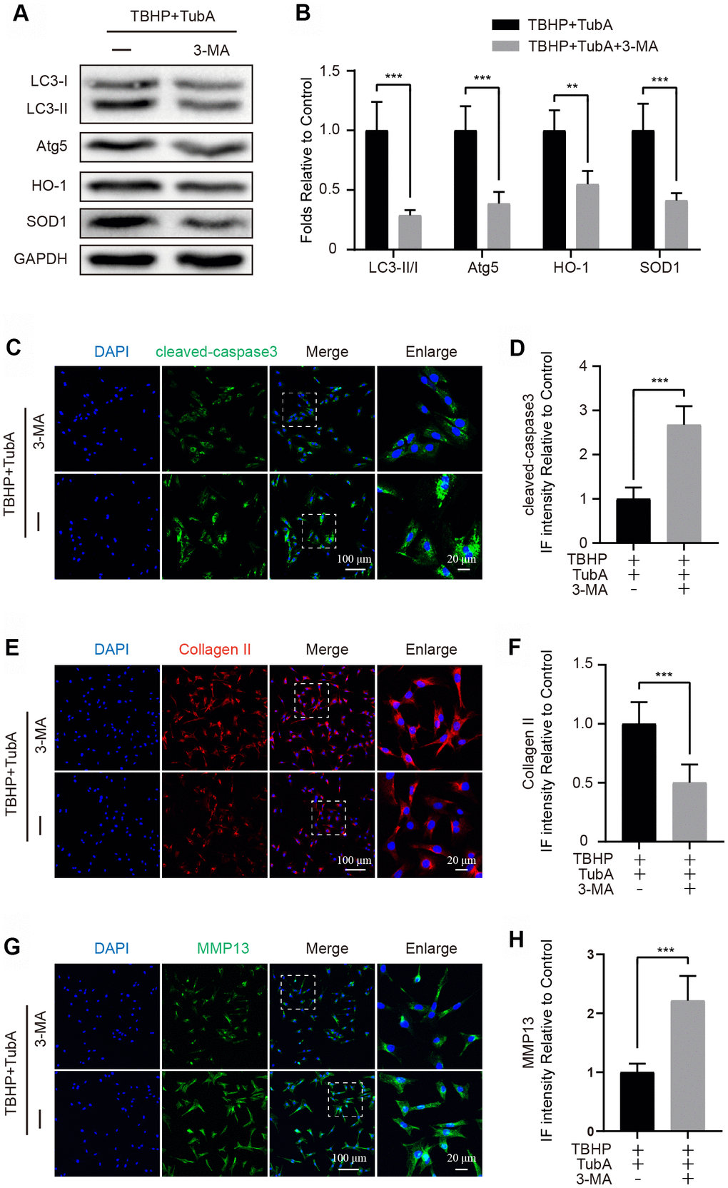 To determine whether TubA-activated autophagy is responsible for cell survival and ECM synthesis, chondrocyte was co-treated with TubA and 3-MA. First, to verify that 3-MA effectively suppresses autophagy in chondrocytes, the autophagy related markers were detected. The results from Western blotting demonstrated that3-MA intervention obviously decreased the expression of LC3II and Atg5 (Figure 6A, 6B). Thus, this result indicated that 3-MA successfully suppresses the autophagy activated by TubA in chondrocytes. Meanwhile, 3-MA co-administration also reduced the level of HO-1 and SOD1 (Figure 6A, 6B). However, as the results of IF showed, co-treatment with 3-MA and TubA also downregulated the intensity of cleaved caspase3 when compared with TubA treatment only (Figure 6C, 6D). Considering ECM, the results from IF showed that co-treatment of 3-MA remarkably decreased the Collagen II intensity (Figure 6E, 6F) but increased the MMP13 level (Figure 6G, 6H). Combining the above results, the advantageous effects of TubA are required for the activation of autophagy.