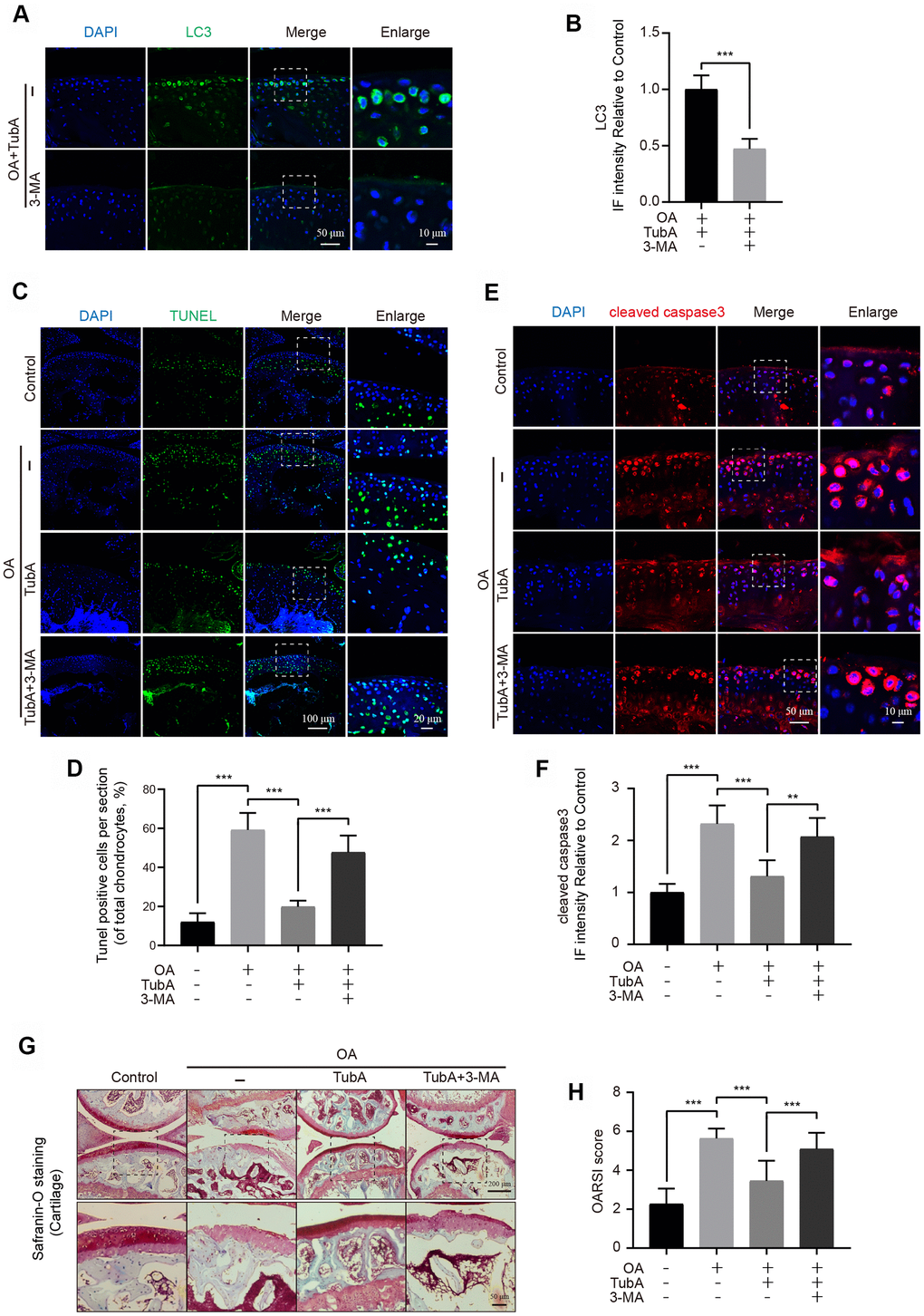 Finally, the potential therapeutic effect of HDAC6 inhibition by TubA on OA progression was assessed in vivo. The mice were treated with TubA, and experiments including TUNEL, Safranin O and IF staining were performed for evaluating histomorphology change in the mouse knee joints. Firstly, TubA treatment effectively decreased the expression of HDAC6 in the cartilage of OA mice (Supplementary Figure 2A, 2B). TUNEL staining revealed that the proportion of cellular apoptosis is lower in the TubA treatment group than in the OA group (Figure 7C, 7D). As the results showed in Figure 7E, 7F, the signal intensity of cleaved caspase3 was significantly reduced after administration of TubA compared with the OA group. Meanwhile, the results of Safranin O staining showed that the OA group exhibits the aberrance and hypocellularity of the superficial articular cartilage, while TubA reverses these pathological alterations and makes joints more integral and smooth (Figure 7G). Consistent with the Safranin O staining, the results of the OARSI were also decreased in the treatment group (Figure 7H). In addition, we also evaluated whether the effect of TubA is related to autophagy activation in vivo. IF showed that co-treatment with 3-MA effectively inhibits the level of LC3 in chondrocytes of the joint (Figure 7A, 7B). Like the results with chondrocytes in vitro, 3-MA intervention abolished the beneficial outcomes mediated by TubA on OA (Figure 7). Based on these findings, HDAC6 inhibition by TubA provides a protective effect on OA degeneration in DMM mice.