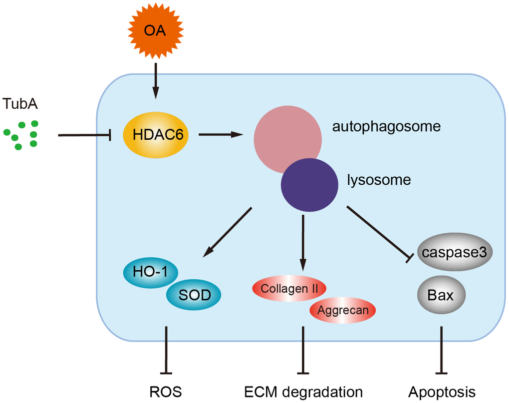 In conclusion, the current study suggested that the expression of HDAC6 is elevated in OA mice. Inhibition of HDAC6 by TubA activates autophagy and enhances autolysosome formation, sequentially attenuating oxidative stress, inhibiting apoptosis and reducing ECM degradation in chondrocytes and preventing OA development in mice. Collectively, the inhibition of HDAC6 by TubA exhibits a novel potential therapeutic strategy for the management of OA.