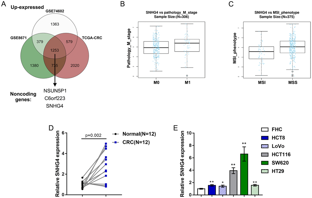As mentioned above, we downloaded and analyzed three sets of publicly available microarray expression profiles, namely, the GSE8671, GSE74602, and TCGA Colon and Rectal Cancer (TCGA-CRC) datasets, to identify differentially upregulated lncRNAs in CRC. Through cross-check, we found that a total of 3 lncRNAs, including C6orf223, NSUN5P1 and SNHG4, were significantly upregulated (p < 0.05, log2FC > -0.56) in CRC (Figure 1A). The role of C6orf223 and NSUN5P1 in cancer has not yet been reported, but many studies have shown that SNHG4 is involved in multiple cancers, including osteosarcoma [19], prostate cancer [20], and cervical cancer [21]. Nevertheless, the biological function and underlying molecular mechanism of SNHG4 in CRC remain unclear and require further clarification. As further evidence, according to TCGA-CRC data, SNHG4 expression was dramatically increased in CRC M1-stage (lymphatic or distal metastatic) tissue samples compared with CRC M0-stage (nonmetastatic) tissue samples (Figure 1B) and was markedly enhanced in CRC microsatellite stable (MSS) tissue samples compared with CRC microsatellite instability (MSI) tissue samples (Figure 1C). The expression of SNHG4 was obviously increased in CRC tissues compared with normal noncancerous tissues (Figure 1D). Furthermore, SNHG4 expression was detected in one normal fetal colon cell line (FHC) and five CRC cell lines (HCT8, LoVo, HCT116, SW620, and HT29). The expression of SNHG4 was dramatically upregulated in the HCT116 and SW620 cell lines (Figure 1E); thus, the HCT116 and SW620 cell lines were selected for further experiments.