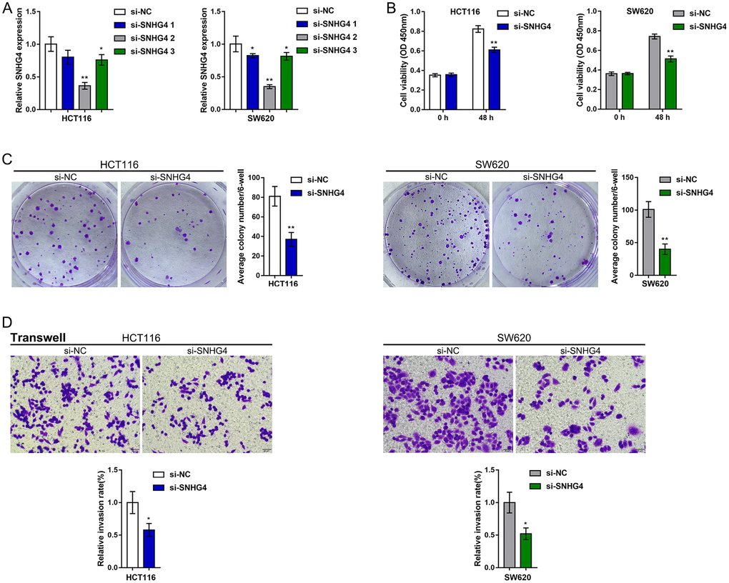 Since SNHG4 expression is significantly upregulated in CRC, to investigate its function, we transfected the HCT116 and SW620 cell lines with si-SNHG4 1/2/3 to knockdown SNHG4, and this knockdown was confirmed by real-time PCR. Then, we selected si-SNHG4 2 because of its higher transfection efficiency (Figure 2A). After knocking down SNHG4, HCT116 and SW620 cell viability and colony formation ability were significantly inhibited (Figure 2B–2C). Then, the effects of SNHG4 knockdown on CRC cell metastasis and microsatellite stability were detected. As shown in Figure 2D, silencing SNHG4 markedly inhibited HCT116 and SW620 cell invasion. The effect of SNHG4 on the expression of microsatellite stability-related proteins (MLH1, PMS2, MSH2, and MSH6) was also determined in SW620 cells (Supplementary Figure 1). Knockdown of SNHG4 markedly inhibited MLH1, PMS2, MSH2, and MSH6 protein expression. In summary, SNHG4 might act as an oncogene in CRC.