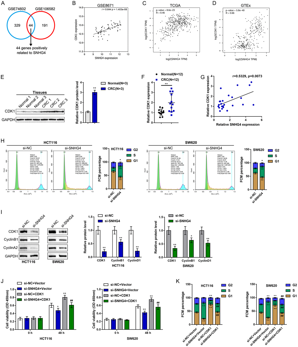 To address the specific effect of SNHG4 in CRC, the present study next knocked down SNHG4 in CRC cell lines with high basal SNHG4 expression levels, namely, HCT116 and SW620 cells. As expected, SNHG4 silencing obviously inhibited HCT116 and SW620 cell viability and colony formation capacity, indicating that SNHG4 knockdown suppressed CRC cell proliferation. Controlling cell proliferation is critical for preventing cancer because cell proliferation exerts important effects on the development of cancers, including the initiation and promotion of tumors [31]. Although the deregulation and control of cancer cell proliferation are complicated, controlling cell proliferation is largely dependent on mechanisms that accelerate or disrupt the cell cycle. Tumor suppressor pathways have been reported to serve as negative signals in transduction systems, leading to cell cycle arrest at different checkpoints [32]. Notably, based on publicly available expression profiles and KEGG and GO analyses, the differentially expressed genes that were positively correlated with SNHG4 were significantly enriched in DNA replication, mismatch repair, and cell cycle pathways, suggesting that SNHG4 might exert its effects through interactions with factors in cell cycle pathways. Thus, CDK1, one of the cyclin-dependent kinases that phosphorylates select proteins to drive cell cycle progression [31], attracted our attention.