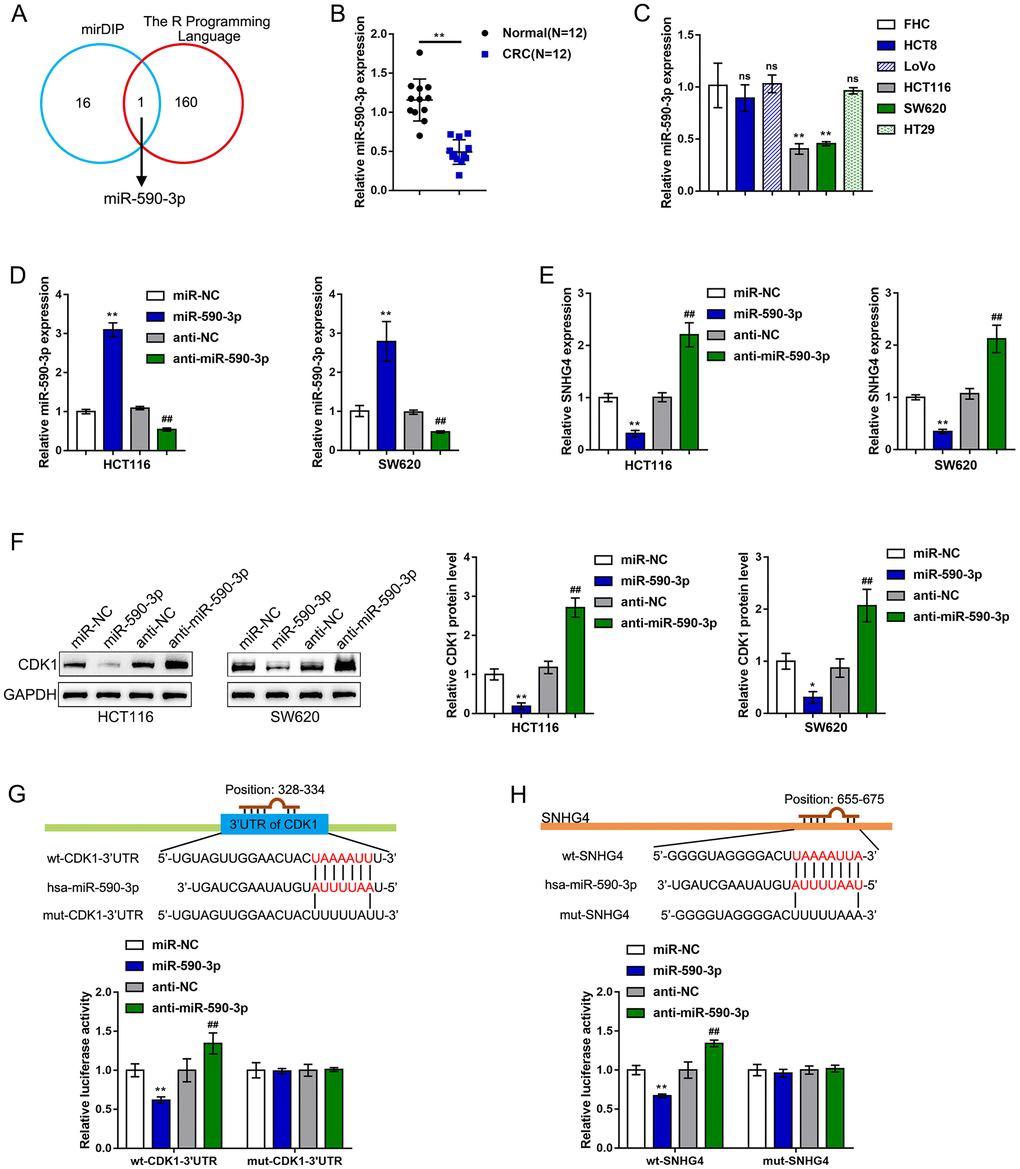 It is widely accepted that lncRNAs can regulate the expression of target mRNAs downstream of miRNAs by interacting with these miRNAs [27, 28]. Herein, the online tool mirDIP and the R programming language (based on the complementary model of 7mer+A or 8mer+A) were used to predict miRNAs that might simultaneously target SNHG4 and the CDK1 3'-UTR, and miR-590-3p was identified (Figure 4A). In contrast to SNHG4 and CDK1 expression, miR-590-3p expression was markedly downregulated in 12 CRC tissue samples compared with normal noncancerous tissue samples (Figure 4B). In addition, miR-590-3p expression was significantly reduced in the CRC HCT116 and SW620 cell lines compared with the normal fetal colon cell line FHC (Figure 4C).