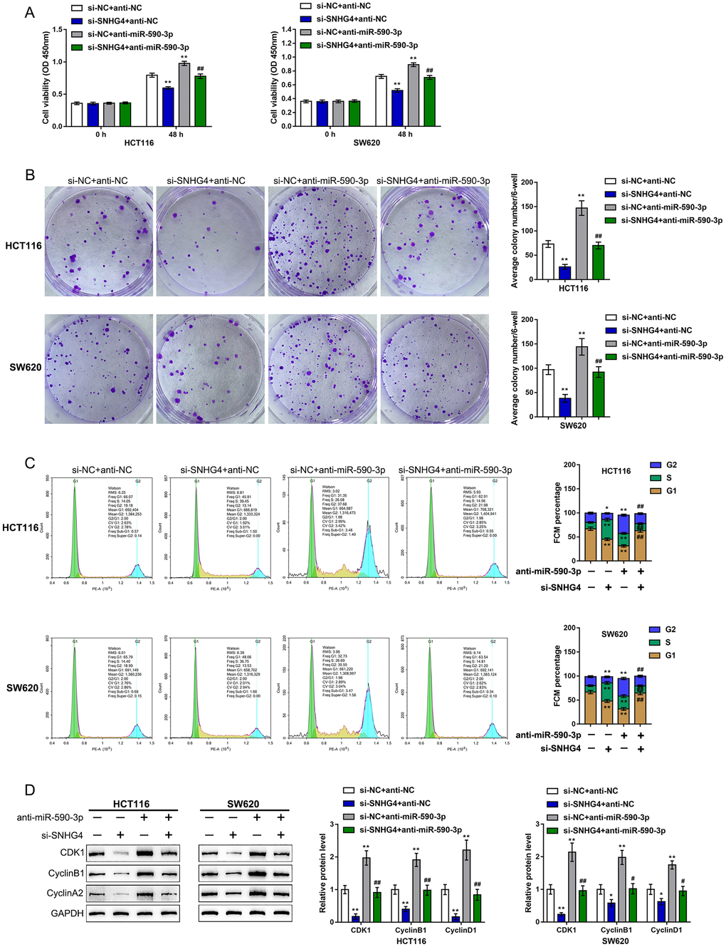Since miR-590-3p binds to both SNHG4 and the CDK1 3'-UTR, we next investigated whether SNHG4 effects CDK1 expression and the CRC cell phenotype through miR-590-3p. We cotransfected HCT116 and SW620 cells with si-SNHG4 and anti-miR-590-3p and assessed related indexes. SNHG4 knockdown significantly inhibited, while miR-590-3p inhibition promoted, HCT116 and SW620 cell viability and colony formation ability; however, miR-590-3p inhibition dramatically attenuated the effects of SNHG4 knockdown (Figure 6A, 6B).