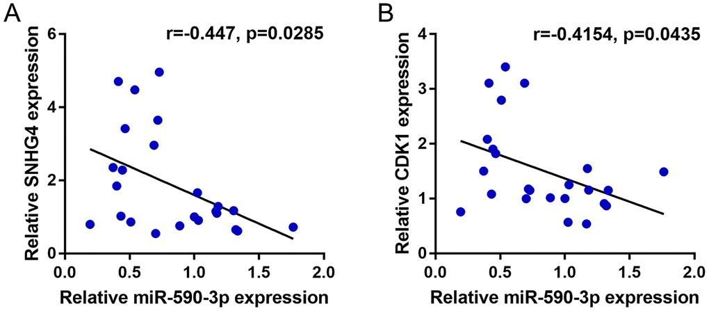 To further confirm the existence of the SNHG4/miR-590-3p/CDK1 axis in CRC, this study finally analyzed the correlation of miR-590-3p with SNHG4 or CDK1. (Figure 7A–7B) shows that miR-590-3p was negatively correlated with SNHG4 and CDK1. Thus, in CRC, SNHG4/miR-590-3p modulates the cell cycle and cell proliferation through the central cell cycle factor CDK1.