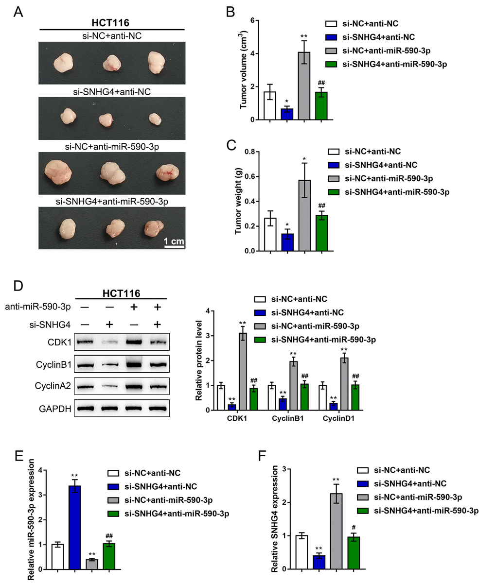 Finally, to further confirm the in vitro findings, we established a subcutaneous transplantation tumor model in nude mice. The mice were divided into four groups: the si-NC + anti-NC group, si-SNHG4 + anti-NC group, si-NC + anti-miR-590-3p group, and si-SNHG4 + anti-miR-590-3p group. The mice received subcutaneous injections according to their groups. At day 35 of injection, the mice were sacrificed, and the tumors were harvested. As shown in (Figure 8A–8C), SNHG4 silencing reduced, whereas miR-590-3p inhibition increased, the tumor volume and tumor weight; the effects of SNHG4 silencing on tumor growth were significantly reversed by miR-590-3p inhibition. Regarding cell cycle markers, SNHG4 silencing increased, whereas miR-590-3p inhibition decreased, the protein levels of CDK1, cyclinB1, and cyclinA2 in the tumor samples; the effects of SNHG4 silencing on cell cycle markers were also significantly reversed by miR-590-3p inhibition (Figure 8D). In addition, the effect of SNHG4 on miR-590-3p expression was also determined in the mouse tumors. SNHG4 silencing increased, whereas miR-590-3p inhibition decreased, the expression level of miR-590-3p (Figure 8E). Additionally, the expression of SNHG4 was validated in the mouse tissues (Figure 8F). SNHG4 knockdown notably decreased, whereas miR-590-3p inhibition increased, the expression level of SNHG4.