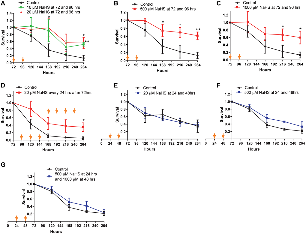 Next, we examined if the extension of CLS was dependent on the concentration of NaHS. Two treatments with 10 or 20 μM of NaHS at 72 and 96 hours after inoculation extended lifespan (Figure 2A), although less significantly than treatments at 100 μM (comparing to Figure 1E). And treatments with 500 μM or 1000 μM of NaHS were not more beneficial for lifespan extension than treatment with 100 μM of NaHS (comparing Figure 2B and 2C to Figure 1E). The day to day treatments with 20 μM of NaHS extended the CLS without an accelerated decline in the later stage of lifespan as observed in day to day treatments with 100 μM of NaHS (comparing Figure 2D to Figure 1F), suggesting that the longterm H2S treatment at lower level was less toxic, while still cytoprotective. However, treatments with different concentrations of NaHS at 24 and 48 hours after inoculation did not extend CLS (Figure 2E and 2F). These data suggest that exogenous H2S does not extend yeast CLS if the H2S treatment before 72 hours of growth, which we refer to as the early H2S treatment. Instead, the extension of yeast CLS requires H2S treatment after 72 hours of growth, which we refer to as late H2S treatment.