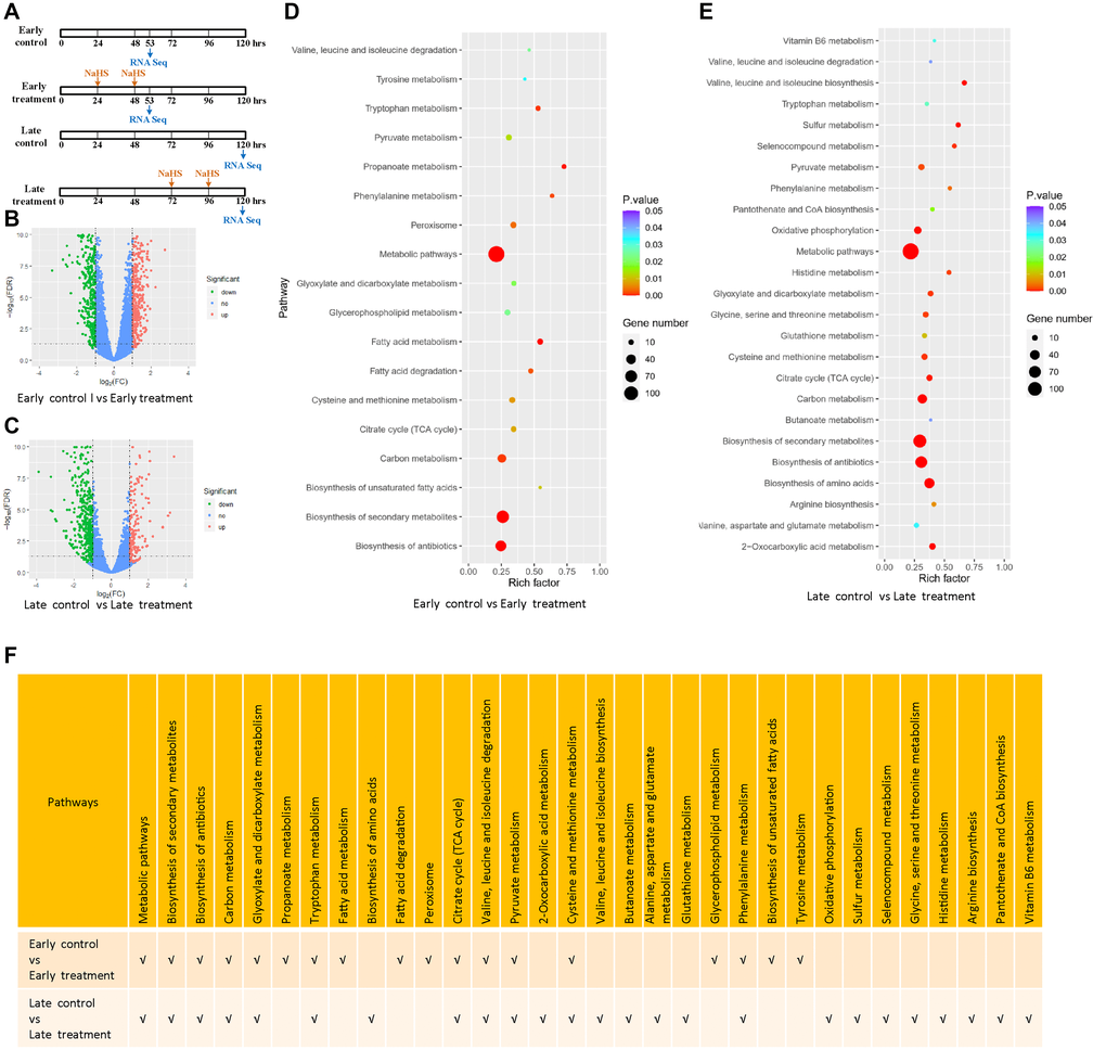 For transcriptome and real-time quantitative PCR (RT-qPCR) analysis, the early treatment comprised 2 doses of 100 μM NaHS at the time as indicated in the figures. The total RNA was extracted using TRIzol Reagent according the manufacturer’s instructions (Invitrogen) and genomic DNA was removed using DNase I (TaKara, China). RNA-seq transcriptome library was prepared using TruSeq RNA sample preparation Kit from Illumina (San Diego, CA, USA). Libraries were size selected for cDNA target fragments of 200–300 bp on 2% Low Range Ultra Agarose followed by PCR amplified using Phusion DNA polymerase (NEB) for 15 PCR cycles. After quantified by TBS380, paired-end RNA-seq sequencing library was sequenced with the Illumina HiSeq xten/NovaSeq 6000 sequencer. The raw paired end reads were trimmed and quality controlled by SeqPrep and Sickle software with default parameters. Then clean reads were separately aligned to reference genome with orientation mode using TopHat software. R statistical package software EdgeR was used for differential expression analysis, heat maps, volcano graphs and bubble charts. For gene ontology term and KEGG (Kyoto encyclopedia of genes and genomes) pathways enrichment analysis, David bioinformatics database (version 6.8) was used.