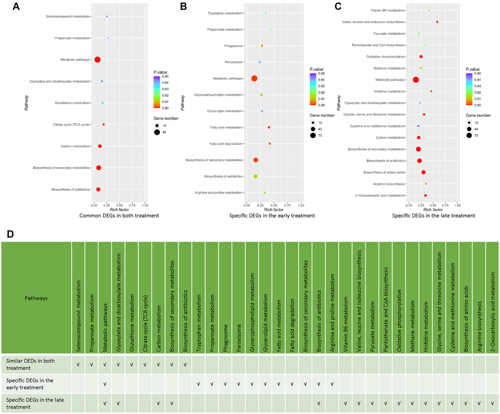 To have a deeper insight to the transcriptomic effects of the early and late NaHS treatments, we identified and analyzed genes, which were altered similarly and differently by these two treatments. There are 213 DEGs common in both treatments, including 177 DEGs regulated in same direction (Supplementary Figure 2A, Supplementary Table 3) and 36 DEGs regulated oppositely (Supplementary Figure 2B, Supplementary Table 3). The remaining 715 DEGs in the early treatment (Supplementary Table 4) and 510 DEGs in the late treatments (Supplementary Table 5) are specific for those treatments, respectively. The KEGG analysis of these DEGs indicates that many metabolic pathways were similarly or specifically regulated by the early and late NaHS treatments (Figure 4A–4D). Therefore, similar to the initial analysis (Figure 3F), the KEGG analysis of DEGs expressed in same direction and DEGs specific to each treatment case also revealed the similarities and differences in the transcriptomic effects of the early and late NaHS treatments. Taken together, these data indicate that both the early and late NaHS treatments had similar and profound influences on some metabolic pathways, which may relate to CLS regulation.