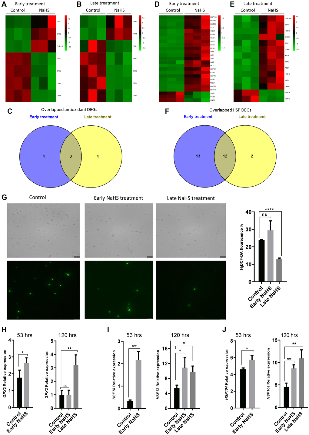 Genes involved in oxidative stress response and heat shock response play essential roles in the regulation of life span [27–31]. To explore the effects of H2S in these stress responses, we identified and analyzed antioxidant genes and heat shock protein (HSP) genes from the DEGs of early and late NaHS treatments. There are 7 antioxidant genes altered by the early and late NaHS treatments (Figure 5A and 5B, Supplementary Table 6). Among them, expression of 3 genes was similarly altered in both treatments including GPX2, TRR2 and CTT1 (Figure 5A–5C). As to HSP genes, 25 and 14 DEGs were found in the early and late NaHS treatments respectively with 12 genes were similarly altered in both treatments (Figure 5D–5F, Supplementary Table 7). The similar alteration in the expression of antioxidant genes and HSP genes under NaHS treatments at two different time points is consistent to the observation that both treatments have some common effects on transcriptome (Figure 4). However, when intracellular ROS was monitored at the 5th day (120 hours after inoculation), the late NaHS treatment decreased ROS production but the early NaHS treatment did not (Figure 5G). When the expression of some of similarly altered antioxidant or HSP genes were examined by qPCR, we found that the up-regulation of HSP78 and HSP104 by the early NaHS treatment persisted to the 5th day of the growth but the up-regulation of GPX2 could not (Figure 5H–5J). Instead, the increased GPX2 level induced by the late NaHS treatment stayed up at the 5th day (Figure 5H, right panel). These data suggest that although the early NaHS treatment provided cyto-protective effects, some of them did not last to the later growth stage when the fitness of the cell is essential for increased lifespan.