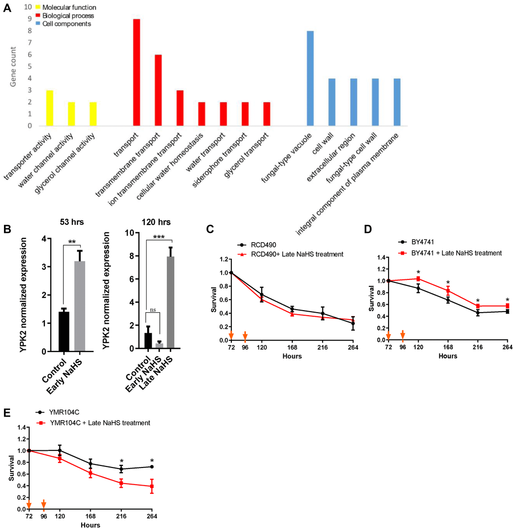 Further analysis of the early and late NaHS treatments identified 36 DEGs that are regulated oppositely (Supplementary Figure 2B, Supplementary Table 4). Interestingly, GO analysis revealed that most of these DEGs regulate cell wall components and transport functions which are also influenced by cell wall [32] (Figure 6A), suggesting there may be a significant difference in the regulation of cell wall integrity between the early and late NaHS treatments. More importantly, these DEGs include YPK2, an AGC-type protein kinase and a key regulator of cell wall integrity [33, 34]. The YPK2 is one of the most significant DEGs by the late NaHS treatment while its expression was not altered by the early NaHS treatment (Supplementary Table 6). The qPCR analysis also verified that the expression of YPK2 was up-regulated about 8-fold by the late NaHS treatment, but not the early NaHS treatment (Figure 6B). Therefore, protein kinase Ypk2 is a potential target of the late NaHS treatment. To test if the increased expression of YPK2 induced by the late NaHS treatment contributes to the life span extension, the life span of RCD490, a YPK2 deletion mutant in the BY4742 background, was monitored with or without the late NaHS treatment. We found that the late NaHS treatment did not increase the life span of RCD490 cells (Figure 6C), indicating YPK2 is required for the life span extension induced by the late NaHS treatment. In addition, the effect of the late NaHS treatment on the CLS of wild type and the ypk2 mutant from BY4741 background was examined. The late NaHS treatment also increased the life span of wild-type BY4741 cells, although to a less extend than it did to BY4742 (Figure 6D).YMR104C, a ypk2 mutant at BY4741 background, lived longer than wild-type cells (compare black lines in Figure 6D and 6E). However, the late NaHS treatment did not increase the life span of YMR104C and even decreased the life span (Figure 6E). These data indicate that, although YPK2 is not a longevity gene by itself, it is required for the life span extension of yeast cells induced by the late NaHS treatment. Therefore, we conclude that in addition to the other pathways altered by the late NaHS treatment, the regulation of cell wall integrity is important for the life span extension.