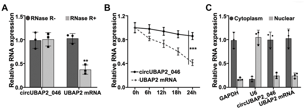 RNase treatment experiment indicated that circUBAP2 was highly stable, compared with UBAP2 mRNA (Figure 1A). Further experiments demonstrated that upon treatment with actinomycin D, which is a transcription inhibitor, circUBAP2 circular transcripts exhibited significantly higher stability compared with linear transcripts of UBAP2 mRNA (Figure 1B). In addition, we compared the expression level of UBPA2 mRNA and circUBAP2 in cytoplasm and nuclear. Results indicated both UBAP2 mRNA and circUBAP2 were significantly enriched in cytoplasm (Figure 1C).