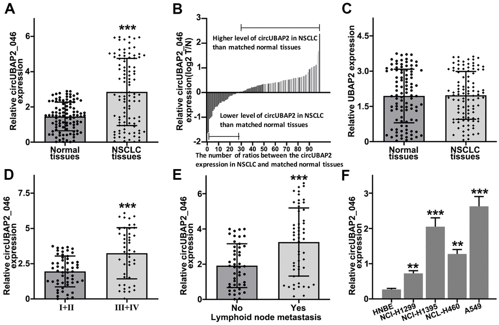 In order to explore the role of circUBAP2 in NSCLC pathogenetic mechanism, we utilized RT-PCR method to detect circUBAP2 expression value in NSCLC and matched normal tissue samples. As a result, circUBAP2 exhibited significantly elevated average level compared with normal tissues (Figure 2A). We further compared the circUBAP2 expression level ratio of NSCLC and matched normal tissues. The results indicated that the majority of the tumor samples exhibited significantly higher level of circUBAP2 expression compared with matched normal tissues (Figure 2B). However, we did not observe significantly different level of UBAP2 mRNA expression level between NSCLC tumor samples and matched normal tissues (Figure 2C). Additionally, we further examined the expression of circUBAP2 level among NSCLC tumor samples of different stages. As a result, tumor samples from advanced-stage NSCLC patients (stage III-IV) showed significantly higher level of circUBAP2 expression level compared with tumor samples from early stages (stage I/II) (Figure 2D). As for patients with lymphoid node metastasis, their tumor samples also exhibited significantly higher level of circUBAP2, compared with those counterparts without lymphoid node metastasis (Figure 2E). Moreover, circUBAP2 expression levels among several NSCLC cell lines (NCI-H1299, NCI-H1395, A549, and NCL-H460) were significantly higher compared to normal human bronchial epithelial cell line HNBE (Figure 2F).