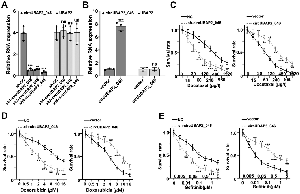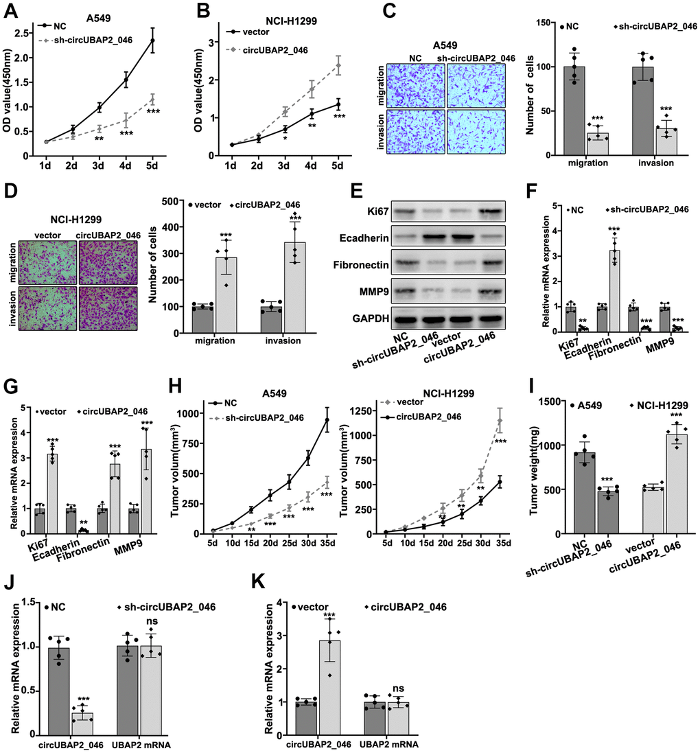 To understand the role of circUBAP2 in biological behavior of NSCLC cell lines, we designed three different circUBAP2-specific shRNAs and circUBAP2 over-expression vector to modulate the expression level of circUBAP2. As shown in Figure 3A, 3B, all three shRNAs and circUBAP2 over-expression vector demonstrated significant suppressive and promoting effects on the expression level of circUBAP2 respectively, while they did not influence the mRNA expression level of UBAP2. Subsequently, we examined the impact of circUBAP2 expression level on cellular survivability under treatment of several chemotherapeutic agent including Docetaxel, Doxorubicin, and Gefitinib by transfecting sh-circUBAP2 and circUBAP2 overexpression vector into A549 and NCI-H1299 cells. As a result, cells transfected with sh-circUBAP2 exhibited significantly suppressed chemo-resistance when treated with escalated dosage of three different chemotherapeutic agents. On the other hand, cells transfected with circUBAP2 over expression vector demonstrated significantly enhanced survivability under treatment of chemotherapeutic agents compared with normal control (Figure 3C–3E). Next, we explored the impact of circUBAP2 modulation on the proliferative abilities of NSCLC cell lines by CCK8 assay. As described in Figure 4A, 4B, circUBAP2 over expression significantly increased the proliferate ability of NCI-H1299 cells while sh-circUBAP2 treated A549 cells suffered significantly suppressed proliferation compared with control group. Furthermore, transwell migration and invasion assay demonstrated that circUBAP2 expression elevation significantly boosted tumor cell invasive and migrated capabilities (Figure 4C, 4D). The above phenomena were also confirmed using Western blot (Figure 4E) and PCR analysis (Figure 4F, 4G) on specific biomarkers of cellular proliferation (Ki67), cellular migration (Fibronectin, MMP9) and adhesiveness (E-Cadherin). Our results suggested that circUBAP2 over expression was significantly related with enhanced cellular expression of Ki67, MMP9 and Fibronectin and suppressed expression of E-Cadherin. Moreover, we further utilized cell-derived xenograft (CDX) model to validate the effects of circUBAP2 expression modulation on tumor growth in vivo. Utilizing RT-PCR method, we detected significant differences in circUBAP2 expression level and comparable UBAP2 mRNA level in sh-circUBAP2 and circUBAP2 over expression groups, compared with controls (Figure 4J, 4K). As a result, circUBAP2 suppression by shRNA significantly hampered the growth of tumor volume from d5 - d35 post-inoculation. While circUBAP2 overexpression significantly accelerated tumor volume growth from d20-d35 post-inoculation (Figure 4H). Consistent results were shown by comparing tumor weight at d35 post-inoculation between circUBAP2 silencing/over expression group and control group, respectively (Figure 4I).