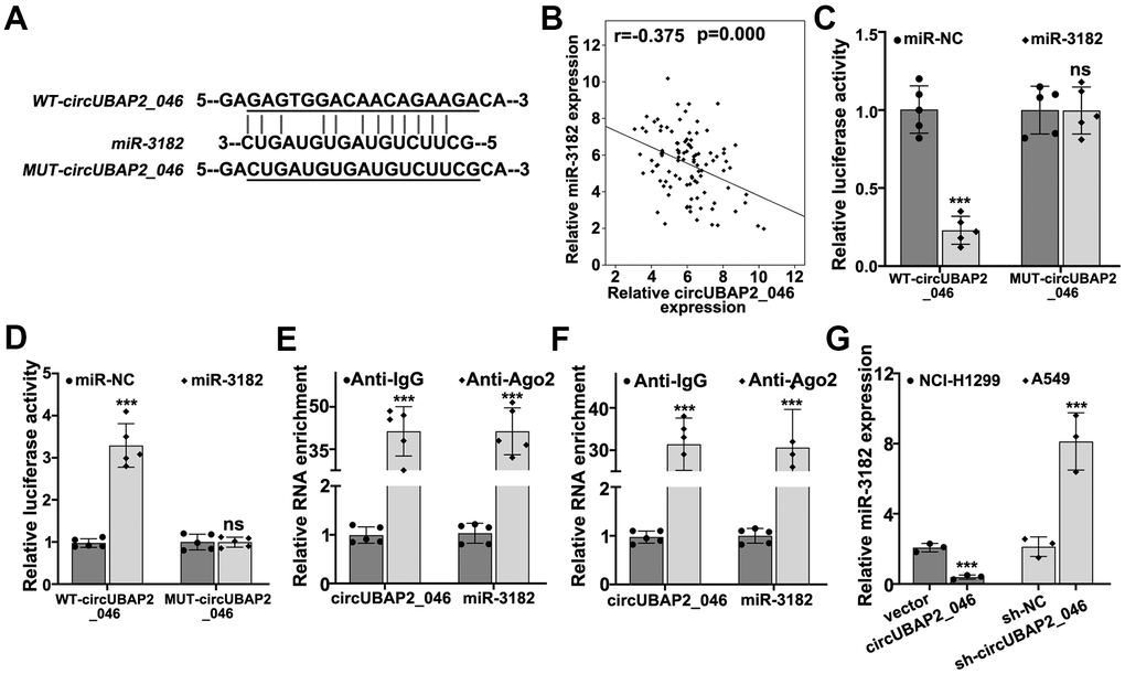 Through interaction with RNA-induced silencing complex (RISC), circRNAs modulate miRNAs expression by acting as molecular sponges. In order to further explore the detailed molecular mechanism of circUBAP2, we performed bioinformatic analysis on binding prediction of circUBAP2. As depicted in Figure 5A, miR-3182 was predicted as potential target miRNA of circUBAP2. NSCLC clinical sample analysis also confirmed that miR-3182 expression level was negatively correlated with circUBAP2 expression (P<0.001). To further validate the potential interaction of miR-3182 and circUBAP2 in vitro, luciferase reporter gene assay was conducted and results indicated that miR-3182 demonstrated significantly decreased luciferase activity compared to control group when transfected with wild-type circUBAP2, while mutated circUBAP2 vectors had no influences on miR-3182 luciferase activity (Figure 5C, 5D). Through RNA immunoprecipitation (RIP) assay, we demonstrated that in A549 and NCI-H1299 cell lines, both circUBAP2 and miR-3182 bind with Ago (Argonaute) antibodies, which is the core protein of RISC, with significantly higher level of enrichment compared with those counterparts binding with control IgG (P<0.001) (Figure 5E, 5F). Moreover, miR-3182 expression was significantly suppressed by circUBAP2 over-expression and was significantly elevated by sh-circUBAP2 treatment (P<0.001).