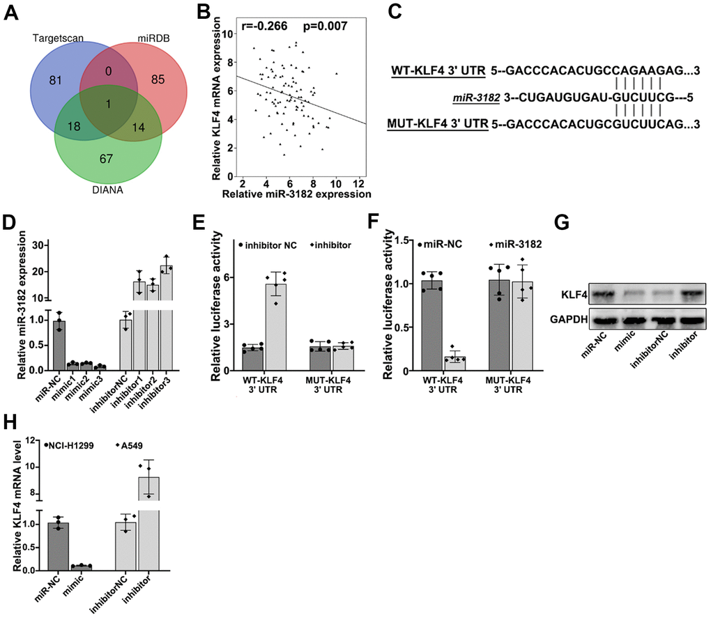 To further understand the target gene regulatory function of miR-3182, bioinformatic prediction of miR-3182 targets genes were performed utilizing public databases including DIANA, TargetScan. miRDB, and KLF4 (Kruppel like factor 4) were shown as the target genes of miR-3182 for all three databases (Figure 6A). RT-PCR study on clinical samples indicated that KLF4 mRNA expression was negatively correlated with miR-3182 level (Figure 6B) (P=0.007). To further validate such modulatory effects of miR-3182 on KLF4 gene, miR-3182 binding site of KLF4 3’UTR region was predicted and vectors containing WT-KLF4-3’UTR and MUT-KLF4-3’UTR regions were generated respectively (Figure 6C). miR-3182 mimics and specific inhibitors were also built (Figure 6D). Dual-luciferase reporter gene assay was performed on A549 and NCI-H1299 cell lines transfected with WT-KLF4-3’UTR and MUT-KLF4-3’UTR, respectively. As a result, miR-3182 specific inhibitors significantly increased KLF4 expression level, while miR-3182 over-expression significantly downregulated KLF4 level. No apparent differences were detected in MUT-KLF4-3’UTR transfection group (Figure 6E, 6F). Consistent results were shown of miR-3182 mimics/inhibitors modulative function on KLF4 protein/mRNA level by Western-Blot and RT-PCR analysis (Figure 6G, 6H).