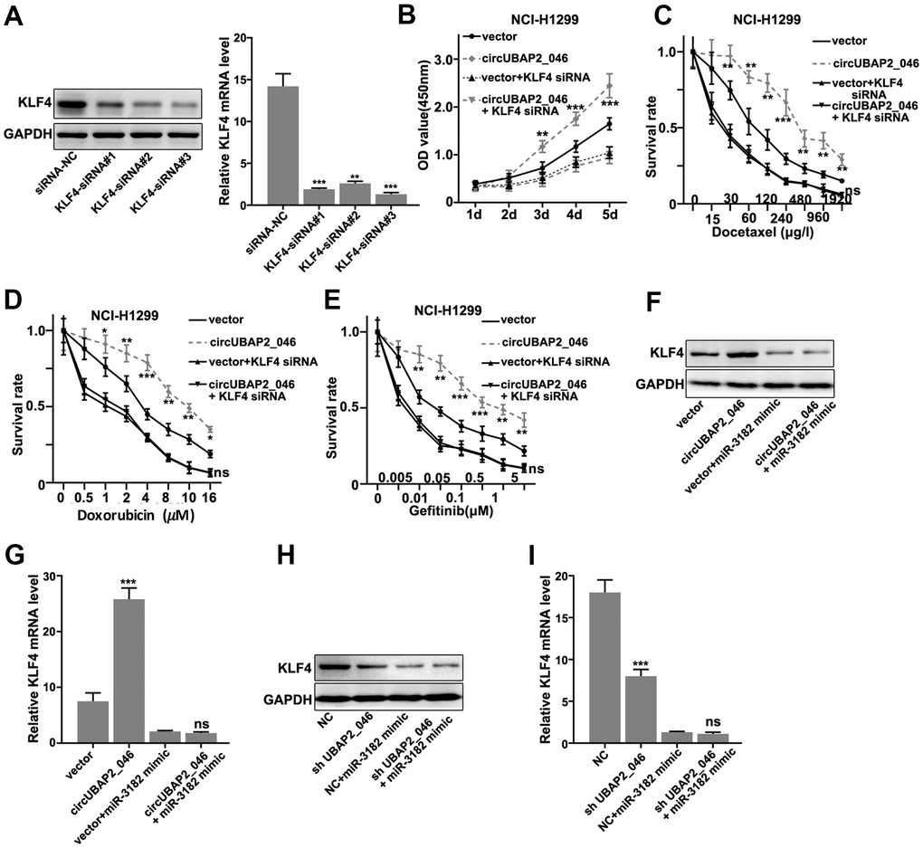 Moreover, in order to validate our findings, we designed KLF4-specific siRNAs and these siRNAs demonstrated significantly suppressive effects on KLF4 mRNA/protein expression (Figure 7A, 7B). CCK8 assay demonstrated KLF4 siRNAs abrogated circUBAP2 promoting effects on NCI-H1299 cell proliferation (Figure 7B). KLF4 siRNAs also abrogated the increased cellular survivability under chemo-agents treatment caused by circUBAP2 overexpression (Figure 7C–7E). Finally, through transfection of miR-3182 mimics and circUBAP2 overexpression vector in A549 and NCI-H1299 cell line, we detected significantly promoted expression of KLF4 mRNA and protein level in circUBAP2 overexpression group, while such effects were abrogated by co-transfection of miR-3182 mimics (Figure 7F–7I).