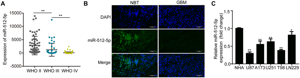 The miRNA expression dataset of glioma was obtained from the Chinese Glioma Genome Atlas (CGGA) database (n = 198). According to the WHO Classification of glioma, the level of miR-512-5p in different grades of glioma was negatively correlated with the degree of malignancy (Figure 1A). The miR-512-5p levels in glioma tissues (WHO I, n = 7; WHO II, n = 26; WHO III, n = 10; WHO IV, n = 28) and non-tumor brain tissues (NBT, n = 8) were determined by RT-qPCR and FISH. miR-512-5p expression was significantly lower in high-grade glioma (HGG) tissues compared with low-grade glioma (LGG) tissues (Table 1, p = 0.0027). Moreover, FISH assays revealed that miR-512-5p expression was lower in GBM tissues compared to NBT (Figure 1B). We also measured miR-512-5p expression in GBM cell lines (U87, U251, A173, T98, LN229) and a NHA cell line by RT-qPCR, and found that miR-512-5p expression was downregulated in the GBM cell lines (Figure 1C). Taken together, our results indicate that miR-512-5p has decreased expression in GBM.