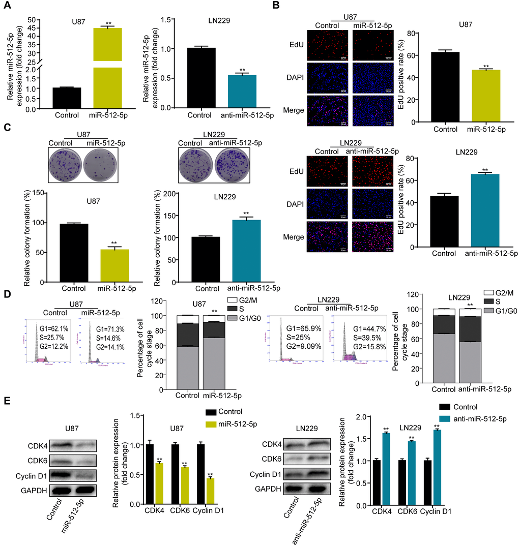 To explore the biological significance of miR-512-5p in GBM, we performed gain- and loss-of-function experiments in the U87 and LN229 cell lines. As shown in Figure 2A, the U87 and LN229 cell lines were successfully transfected with miR-512-5p and anti-miR-512-5p. Furthermore, we performed CCK-8, EdU, colony formation, and flow cytometry assays to evaluate the role of miR-512-5p in GBM cell proliferation and cell cycle. Upregulation of miR-512-5p expression significantly inhibited cell proliferation and cell cycle G1-S phase transition in U87 cells, whereas downregulation of miR-512-5p increased cell proliferation and cell cycle G1-S phase transition in LN229 cells (Figure 2B–2D). Western blotting analysis of G1-arrest-relevant cell cycle regulators confirmed the causes of miR-512-5p-mediated G1-S phase cell cycle arrest. Western blotting analysis also showed that cell cycle-regulated proteins including CDK4, CDK6, and Cyclin D1 were downregulated in U87 with miR-512-5p overexpression, while inhibition of miR-512-5p led to CDK4, CDK6, and Cyclin D1 upregulation (Figure 2E). These results propose that miR-512-5p overexpression inhibits cell proliferation and induces cell cycle arrest in GBM cells.