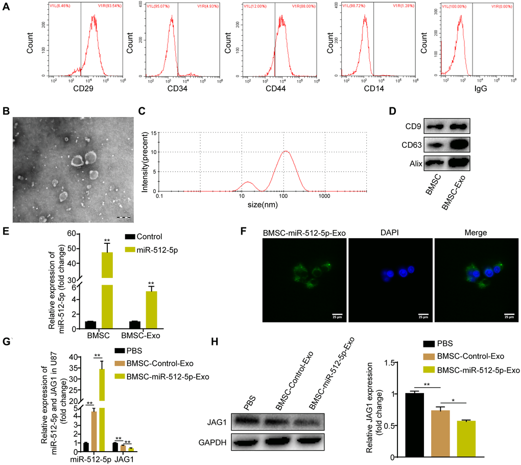 CD44 and CD29 were highly expressed in BMSC while CD14 and CD34 were poorly expressed as determined by flow cytometry (Figure 5A), indicating successful isolation of BMSC. BMSC-derived exosomes were confirmed by TEM (Figure 5B) and DLS (Figure 5C) after ultracentrifugation. The extracted vesicles were spherical and cup-shaped with a diameter of 20–200 nm. Surface membrane proteins (CD63, CD9, Alix) were highly enriched in our isolated exosomes as shown by western blotting (Figure 5D). These results confirm that our isolated vesicles were exosomes. Notably, both BMSC and BMSC-derived exosomes had high miR-512-5p expression after miR-512-5p transfection (Figure 5E). Using fluorescence microscopy, we found that BMSC-derived exosomes could be internalized by U87 cells (Figure 5F). Exosomes from BMSCs transfected with miR-512-5p (BMSC-miR-512-5p-Exo) or controls (BMSC-Control-Exo) were incubated with U87 cells. This increased miR-512-5p expression but decreased JAG1 expression in BMSC-miR-512-5p-Exo based on RT-qPCR and western blotting assays (Figure 5G, 5H).